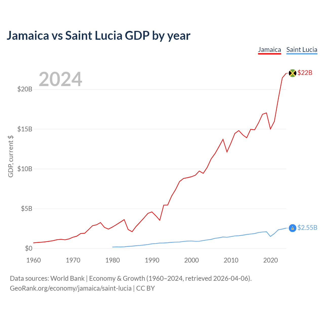 Jamaica vs Saint Lucia GDP by year