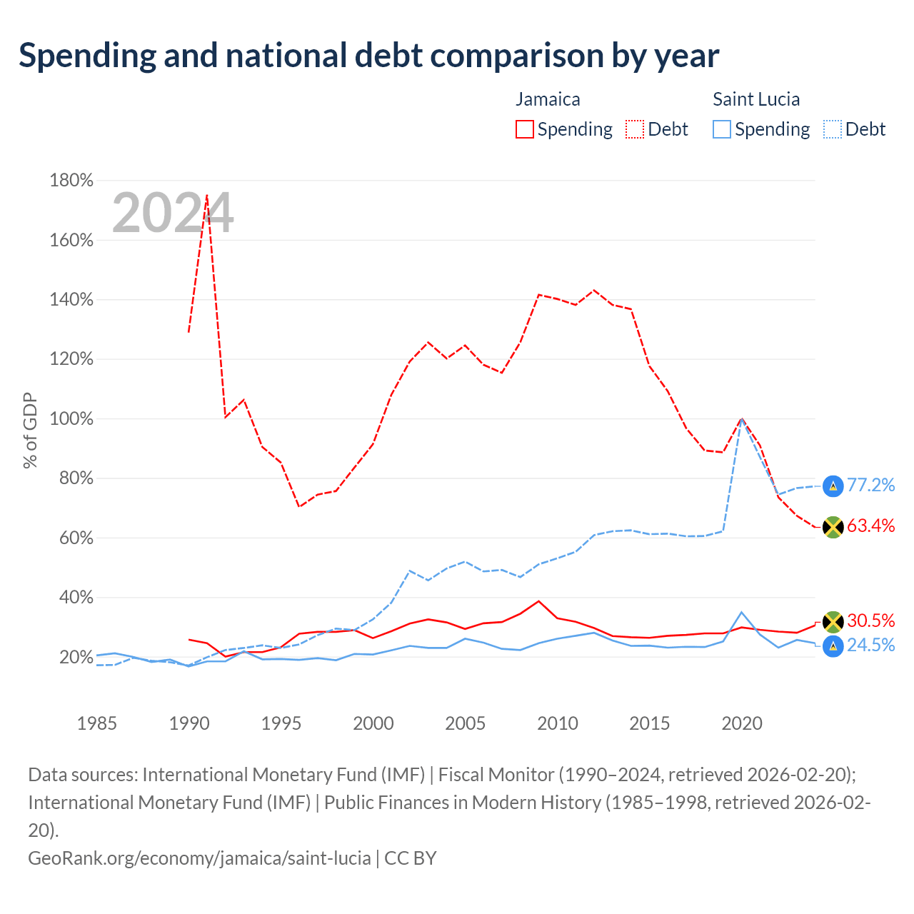 Jamaica has $14B in government debt (63.4% of GDP), compared to $1.97B (77.2% of GDP) in Saint Lucia.