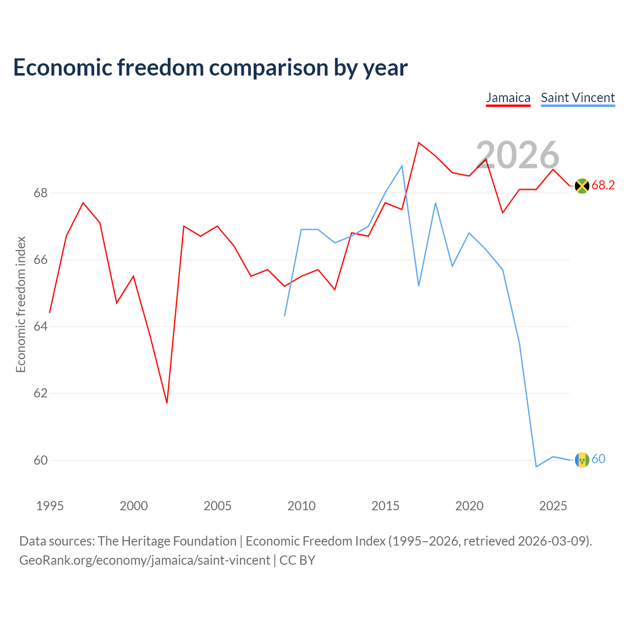 The Economic Freedom Index for Jamaica is 68.2, ranking 48/197, compared to 60 for Saint Vincent, ranking 98/197. The chart above displays a comparison of annual changes in economic freedom indexes.