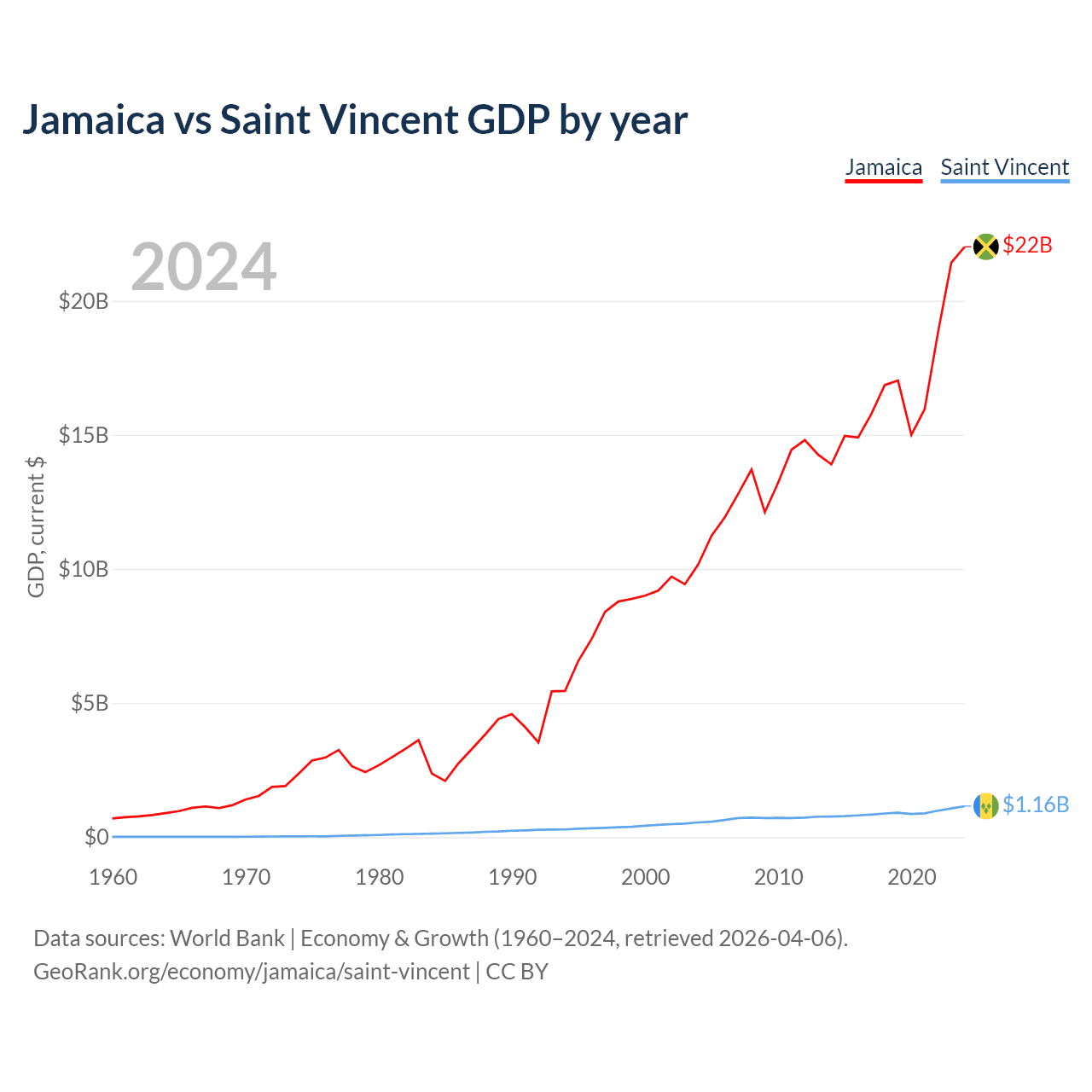 Jamaica has a GDP of $22B compared to $1.16B for Saint Vincent, ranking 124/197 and 186/197 by economy size, respectively.