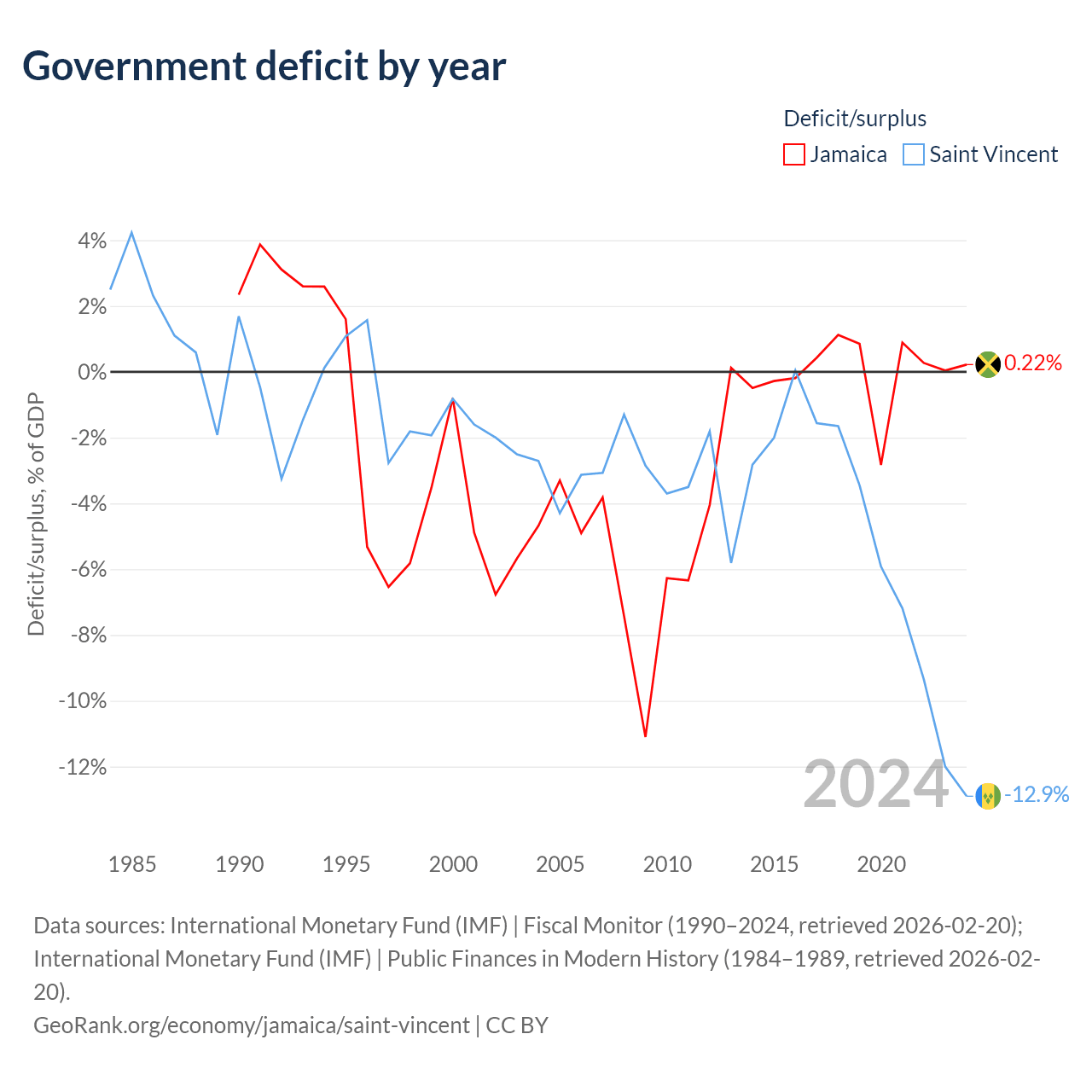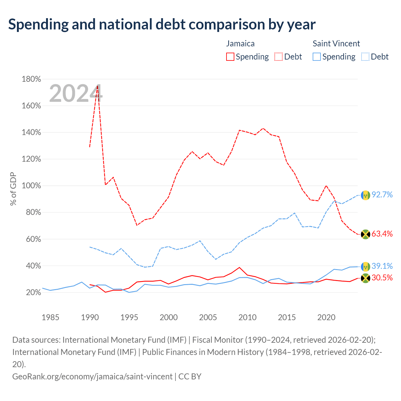 Jamaica has $14B in government debt (63.4% of GDP), compared to $1.07B (92.7% of GDP) in Saint Vincent.