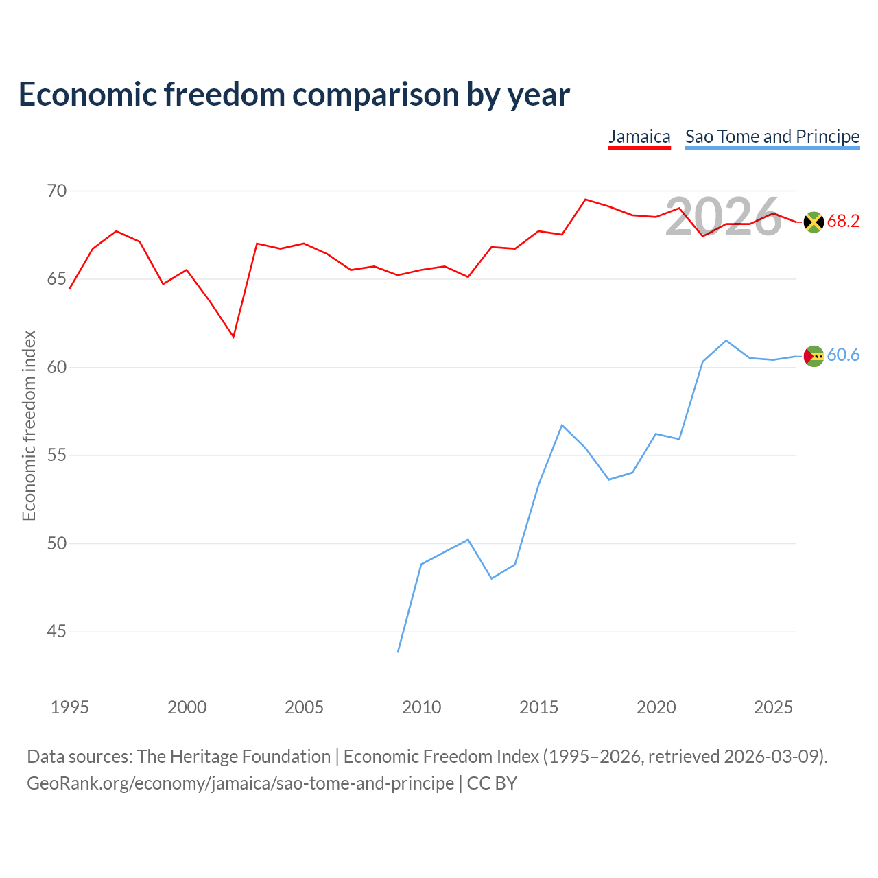 The Economic Freedom Index for Jamaica is 68.2, ranking 48/197, compared to 60.6 for Sao Tome and Principe, ranking 93/197. The chart above displays a comparison of annual changes in economic freedom indexes.