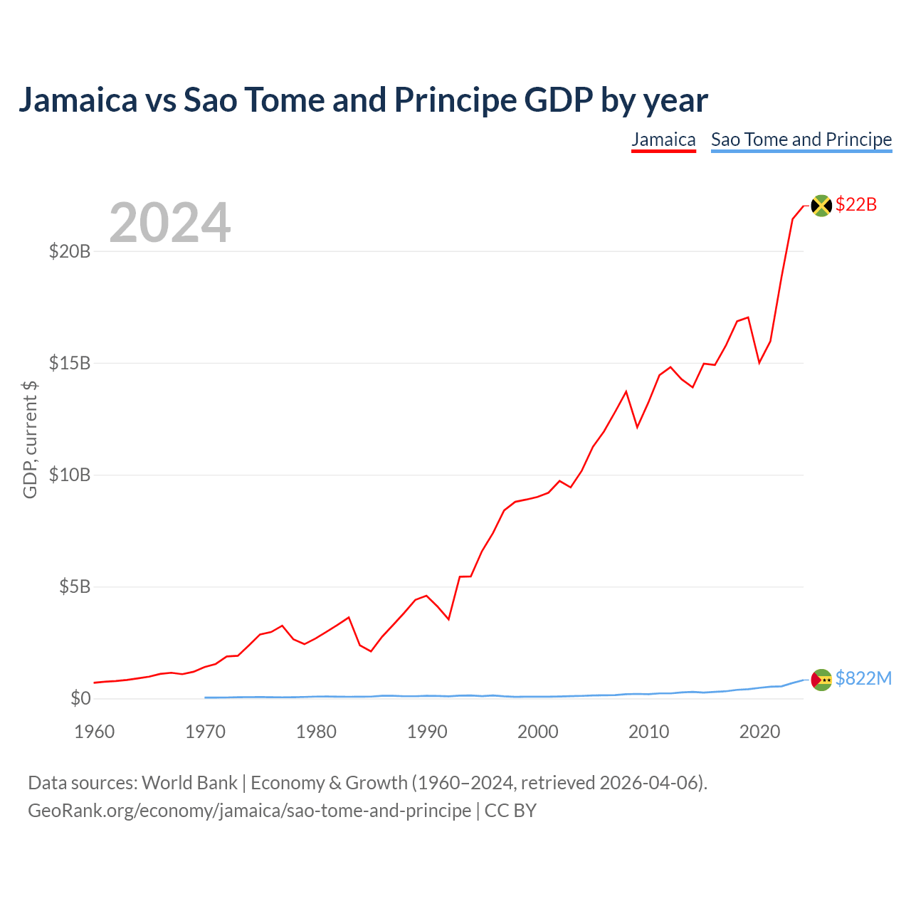 Jamaica has a GDP of $22B compared to $822M for Sao Tome and Principe, ranking 124/197 and 189/197 by economy size, respectively.