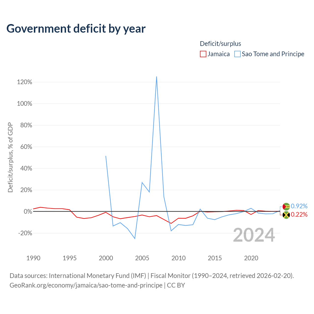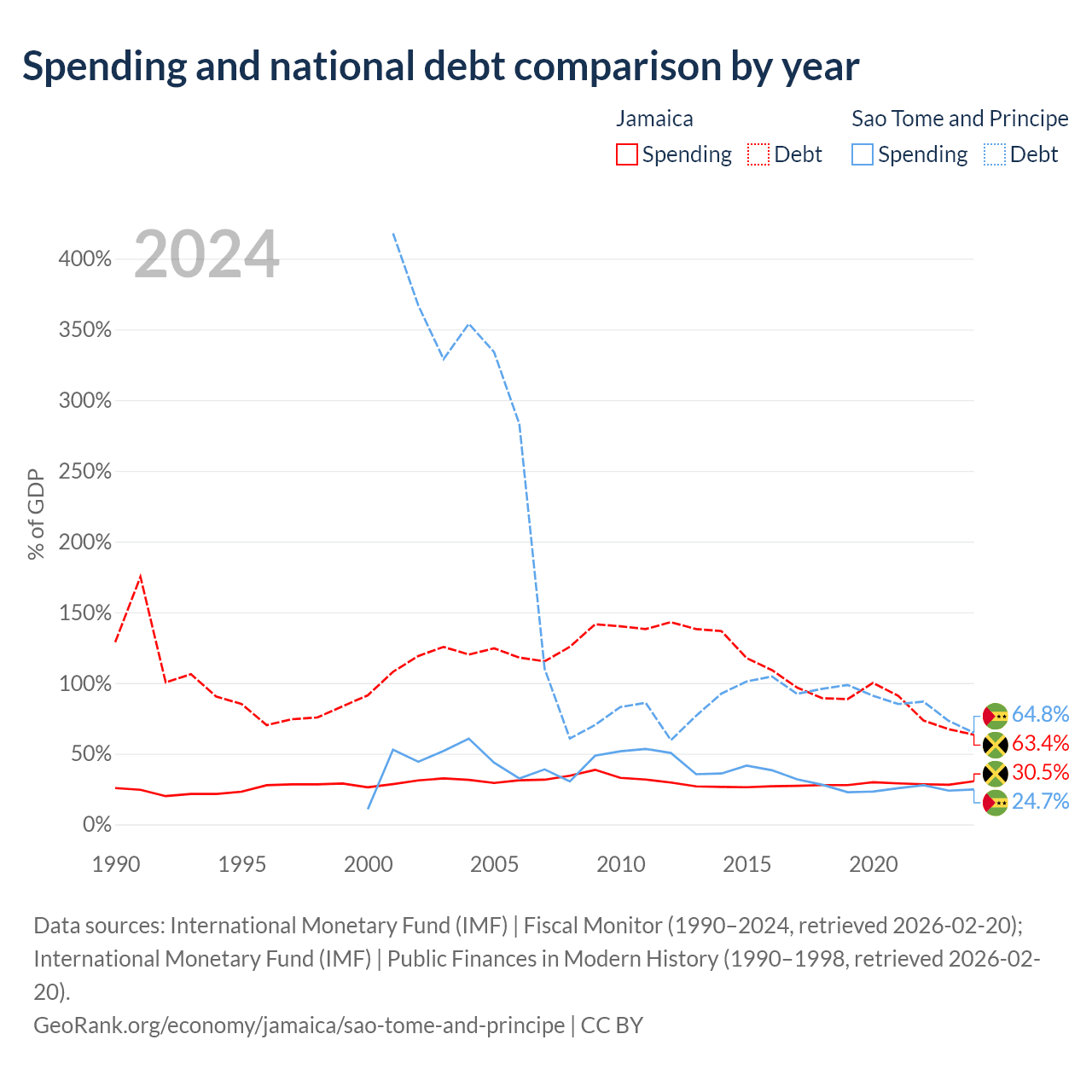 Jamaica has $14B in government debt (63.4% of GDP), compared to $533M (64.8% of GDP) in Sao Tome and Principe.