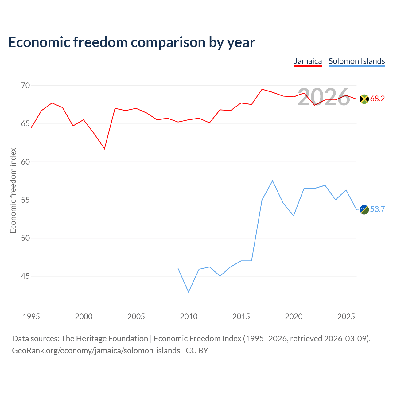 The Economic Freedom Index for Jamaica is 68.2, ranking 48/197, compared to 53.7 for the Solomon Islands, ranking 137/197. The chart above displays a comparison of annual changes in economic freedom indexes.