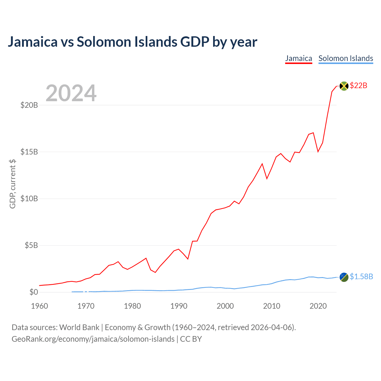 Jamaica has a GDP of $22B compared to $1.58B for the Solomon Islands, ranking 124/197 and 182/197 by economy size, respectively.