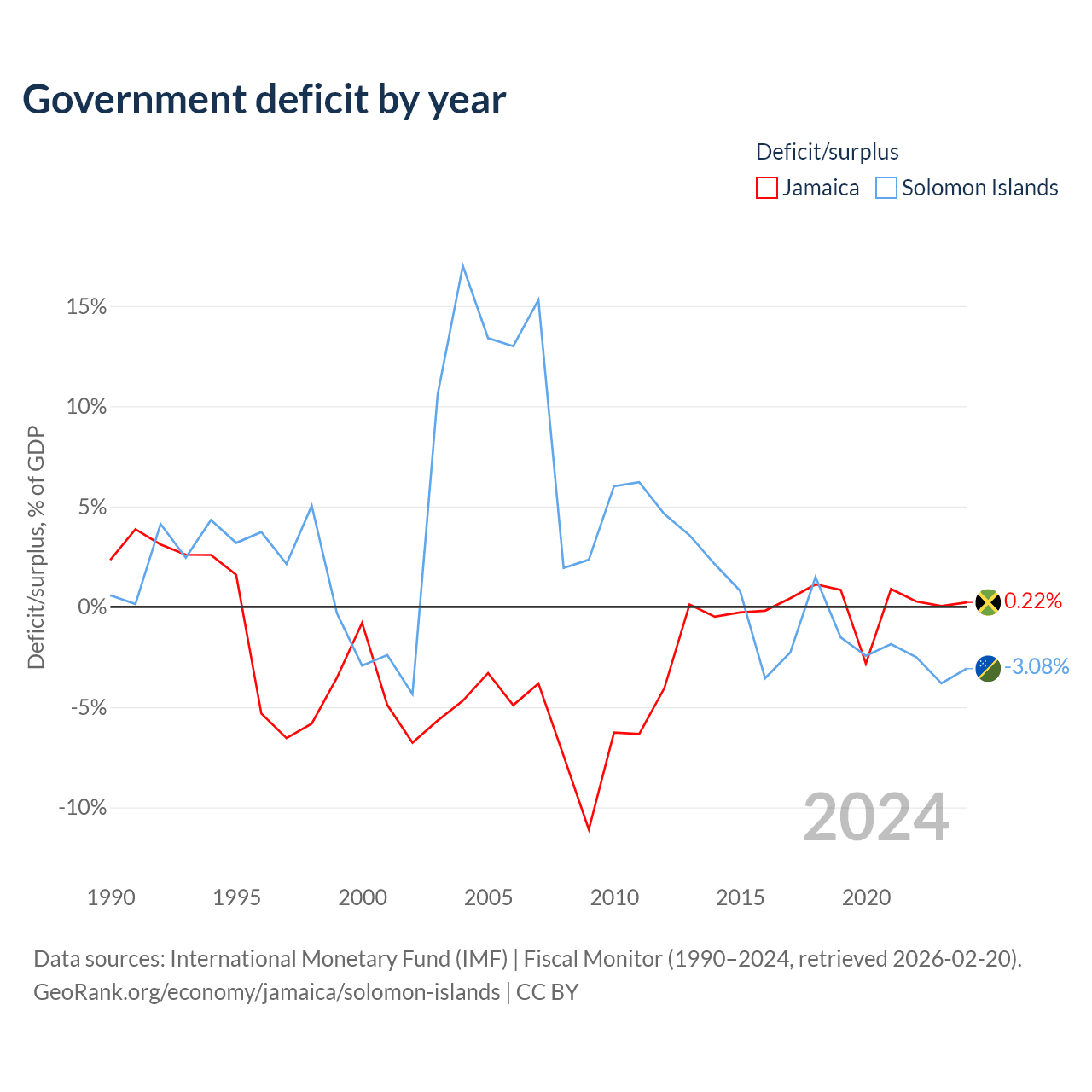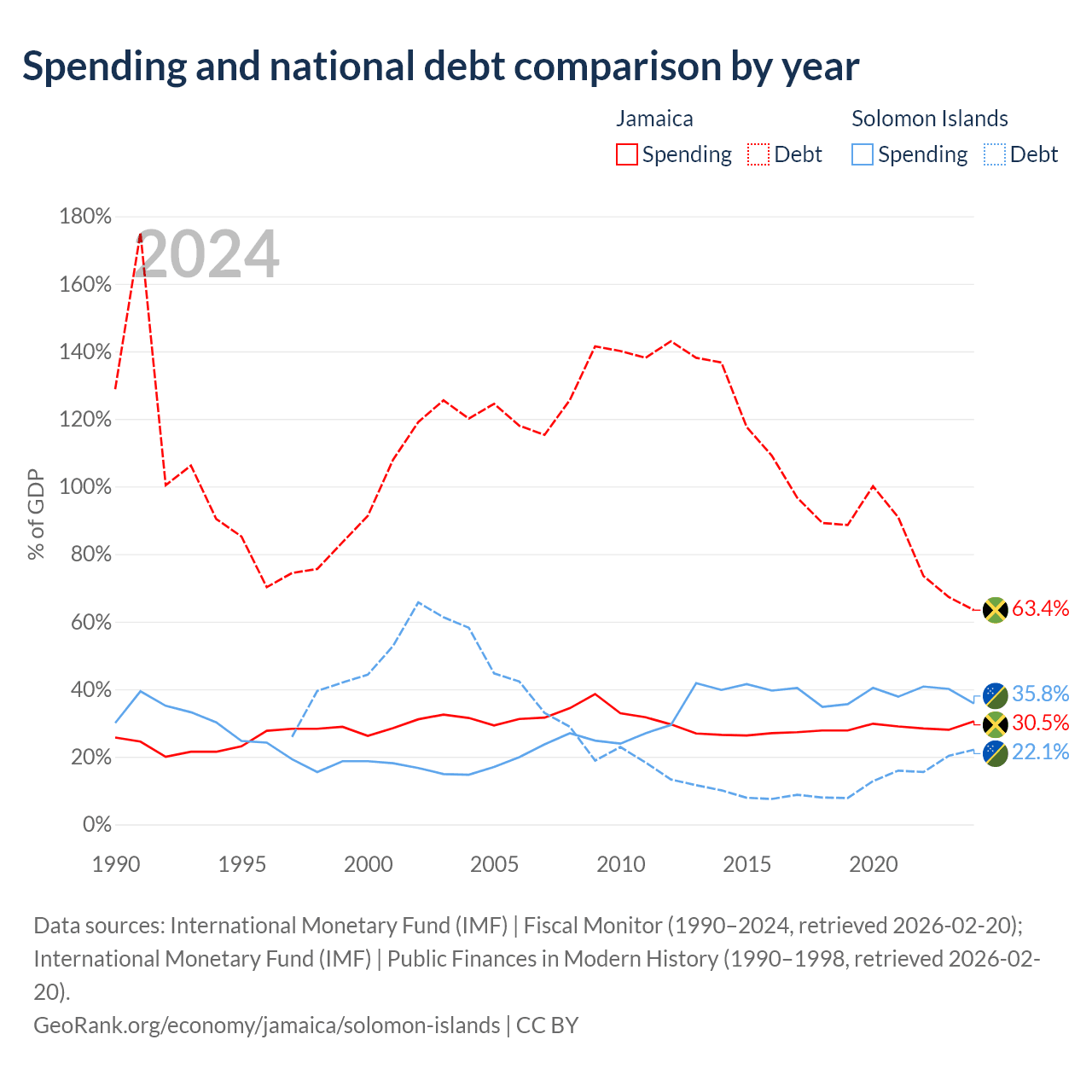 Jamaica has $14B in government debt (63.4% of GDP), compared to $350M (22.1% of GDP) in the Solomon Islands.