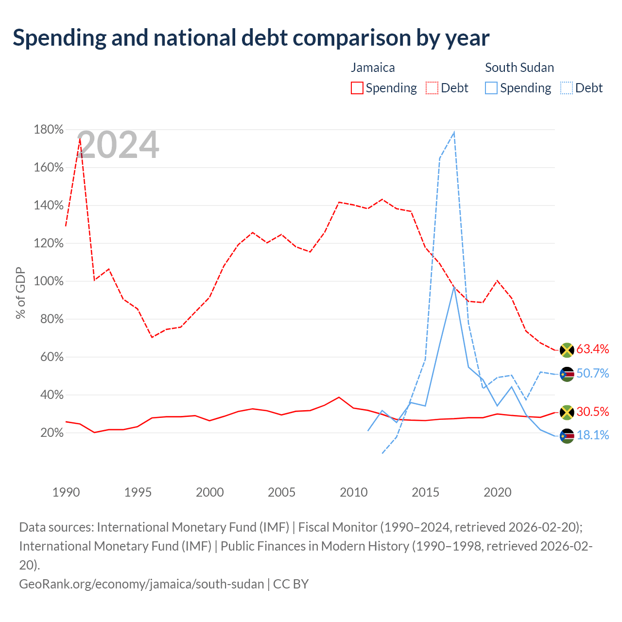 Jamaica has $14B in government debt (63.4% of GDP), compared to $7.04B (50.7% of GDP) in South Sudan.
