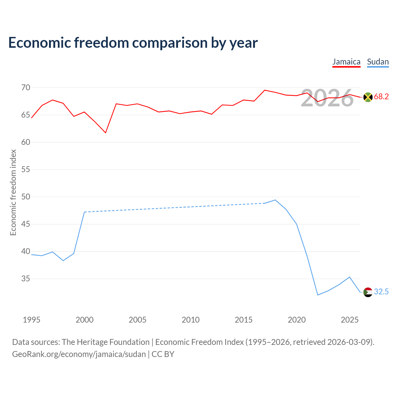 The Economic Freedom Index for Jamaica is 68.2, ranking 48/197, compared to 32.5 for Sudan, ranking 191/197. The chart above displays a comparison of annual changes in economic freedom indexes.