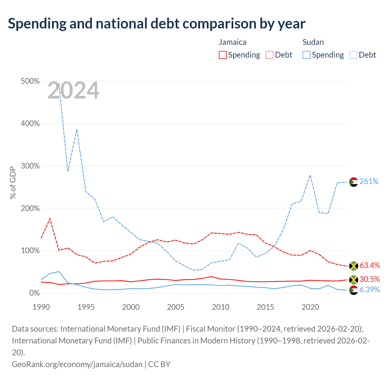 Jamaica has $14B in government debt (63.4% of GDP), compared to $130B (261.4% of GDP) in Sudan.