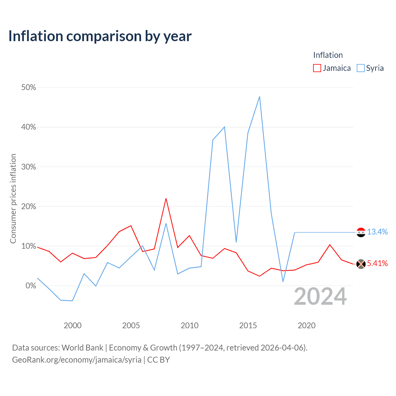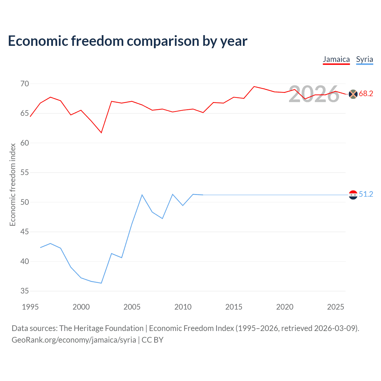 The Economic Freedom Index for Jamaica is 68.2, ranking 48/197, compared to 51.2 for Syria, ranking 155/197. The chart above displays a comparison of annual changes in economic freedom indexes.