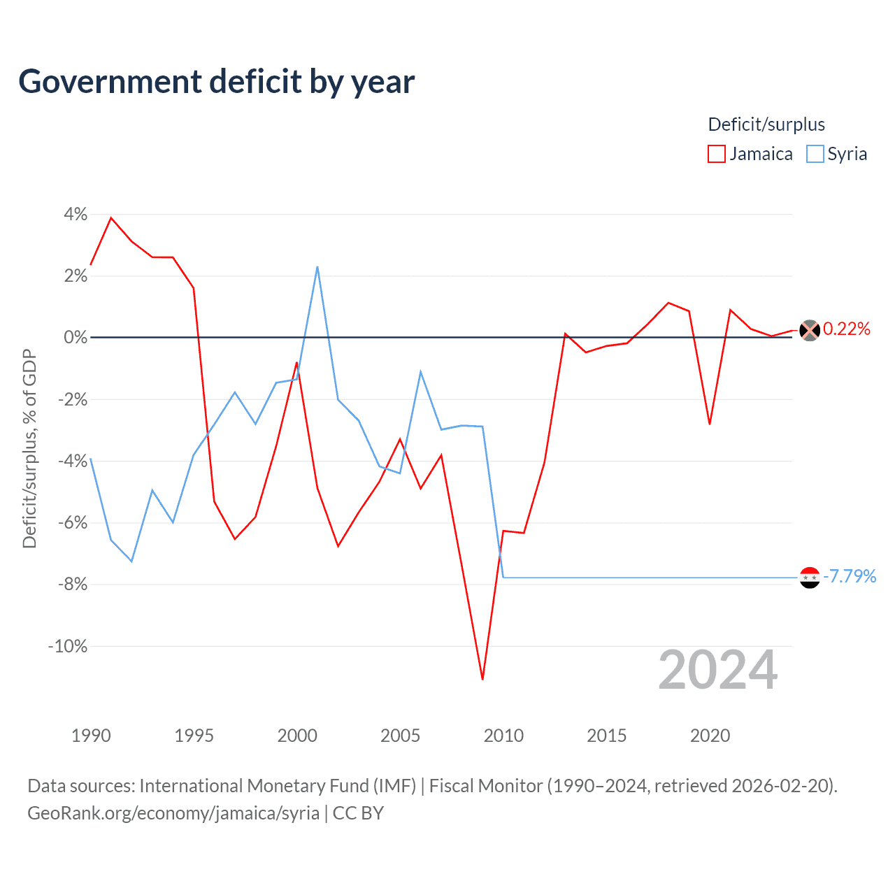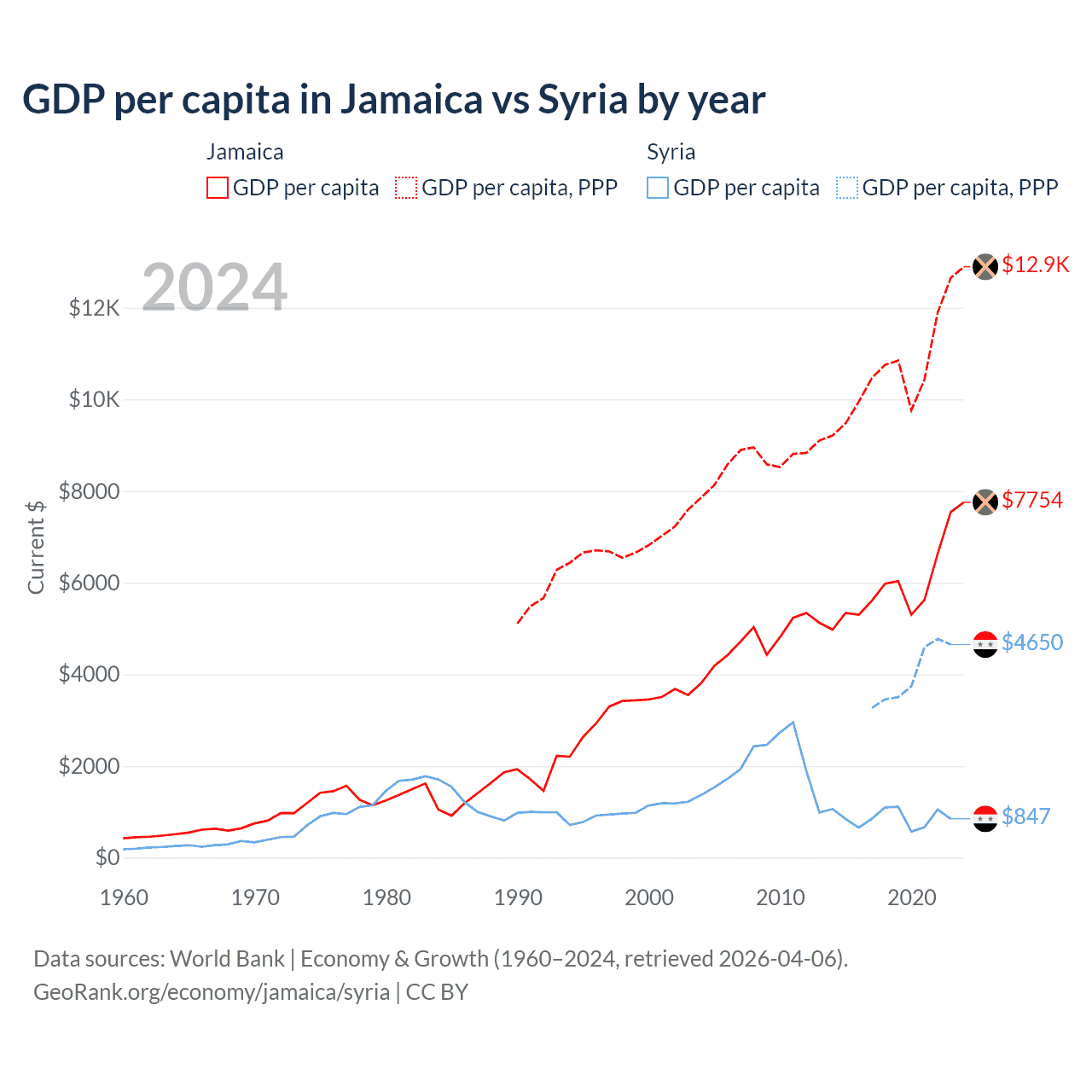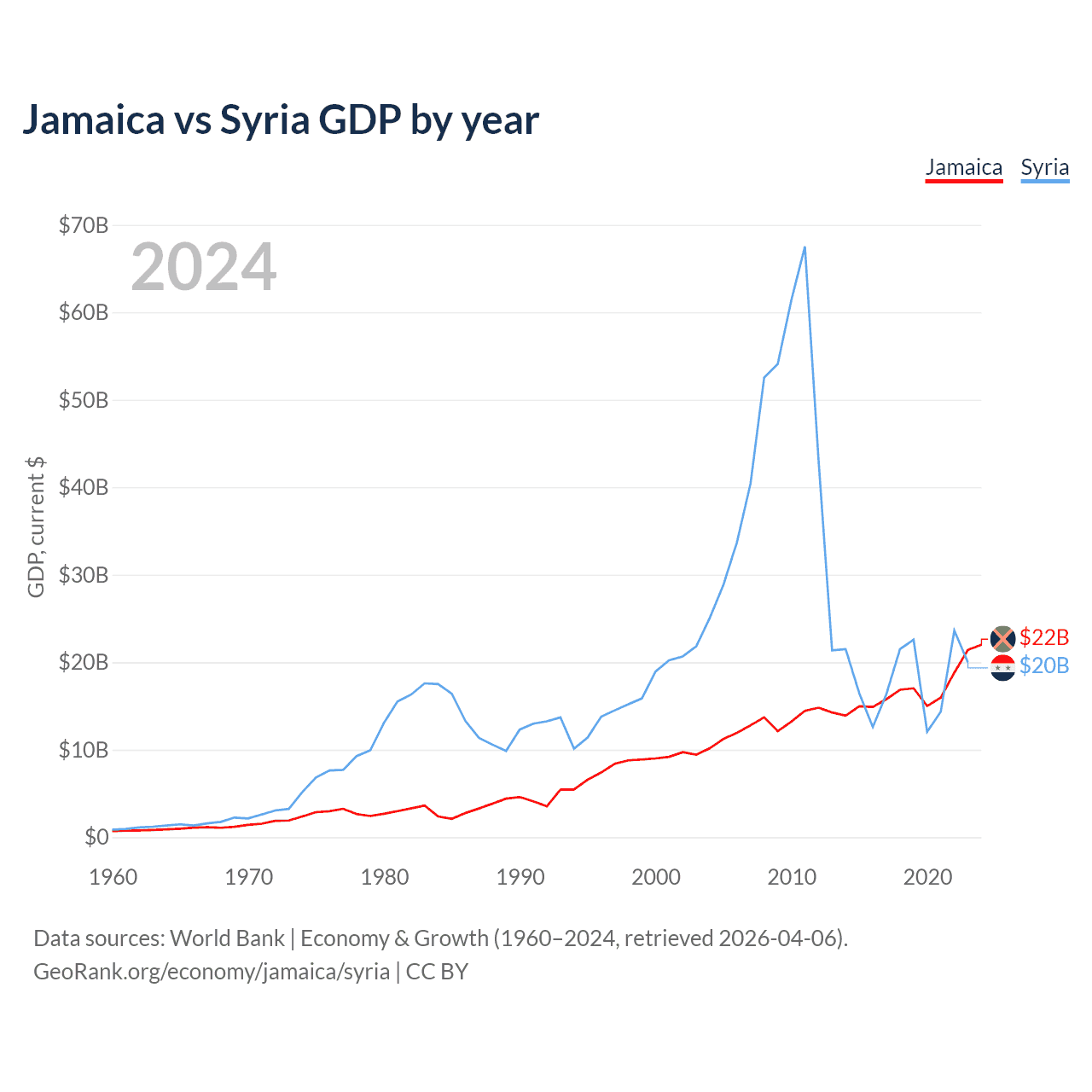 Jamaica has a GDP of $22B compared to $20B for Syria, ranking 124/197 and 129/197 by economy size, respectively.