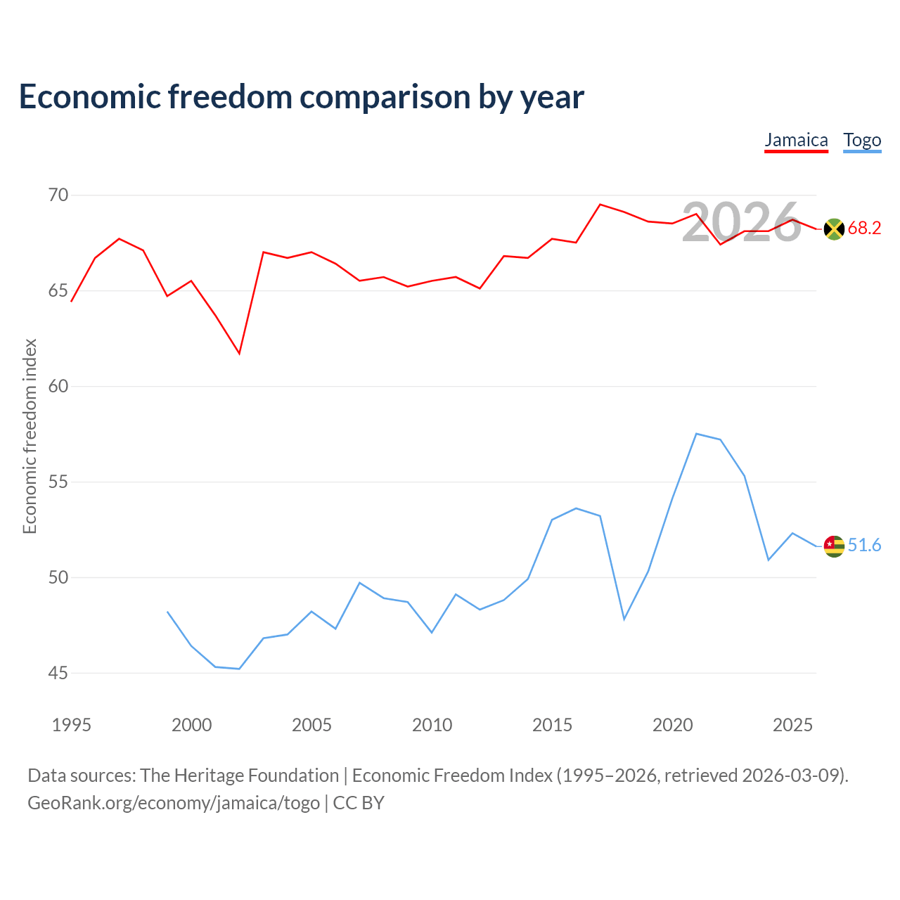 The Economic Freedom Index for Jamaica is 68.2, ranking 48/197, compared to 51.6 for Togo, ranking 153/197. The chart above displays a comparison of annual changes in economic freedom indexes.