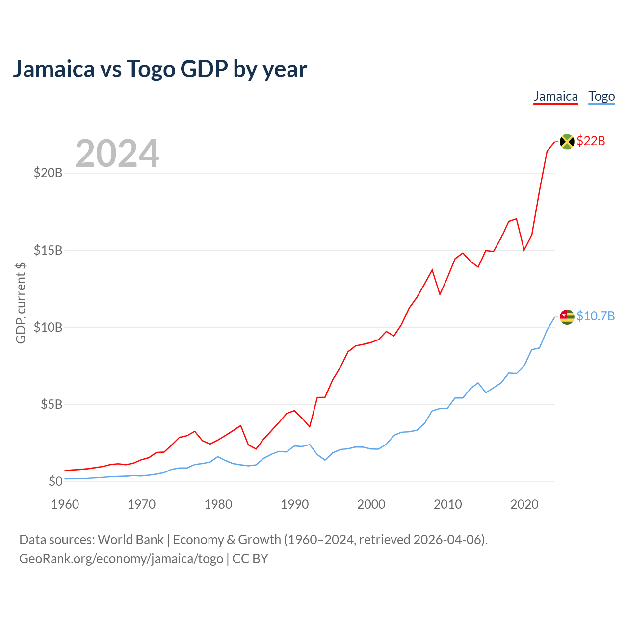 Jamaica has a GDP of $22B compared to $10.7B for Togo, ranking 124/197 and 154/197 by economy size, respectively.
