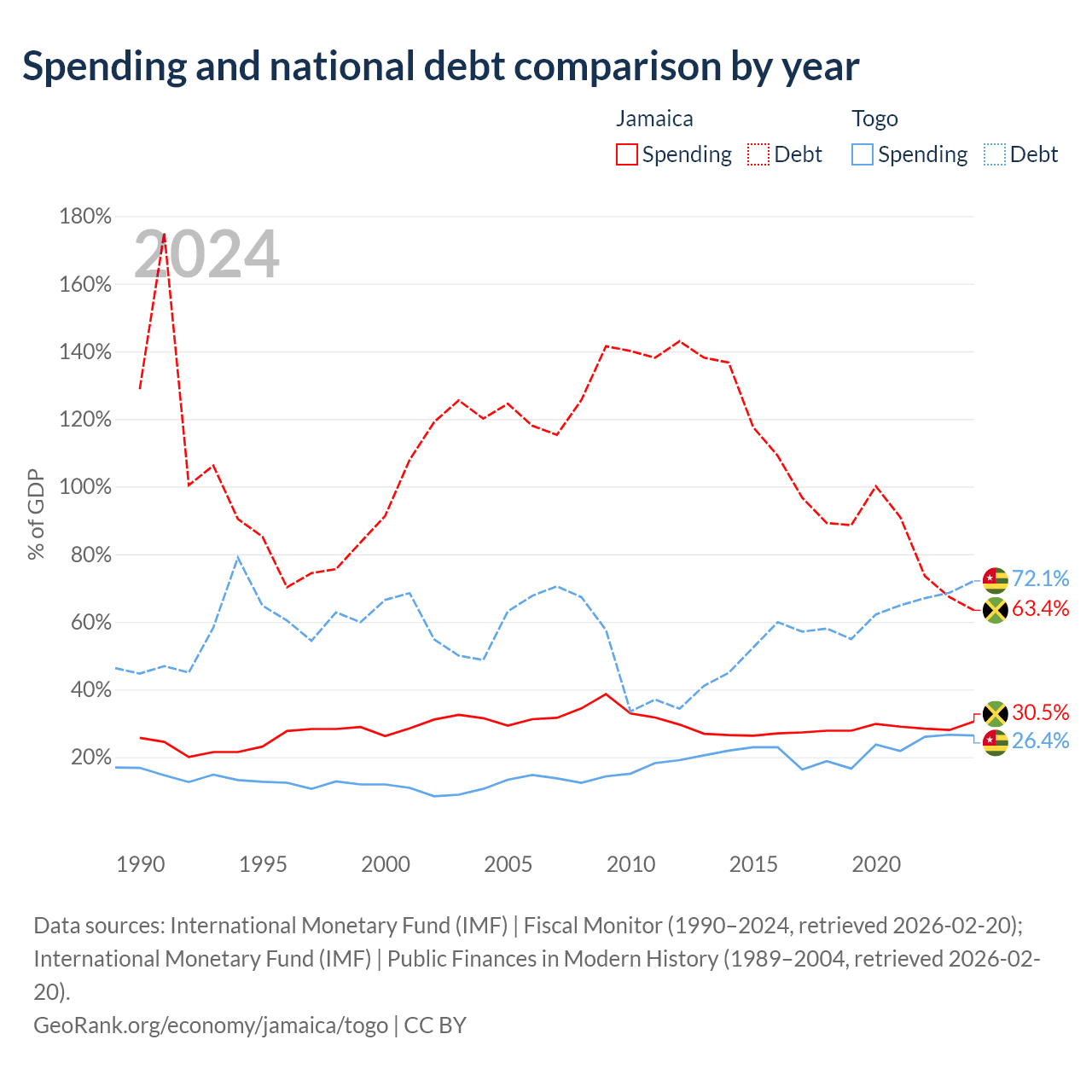 Jamaica has $14B in government debt (63.4% of GDP), compared to $7.68B (72.1% of GDP) in Togo.