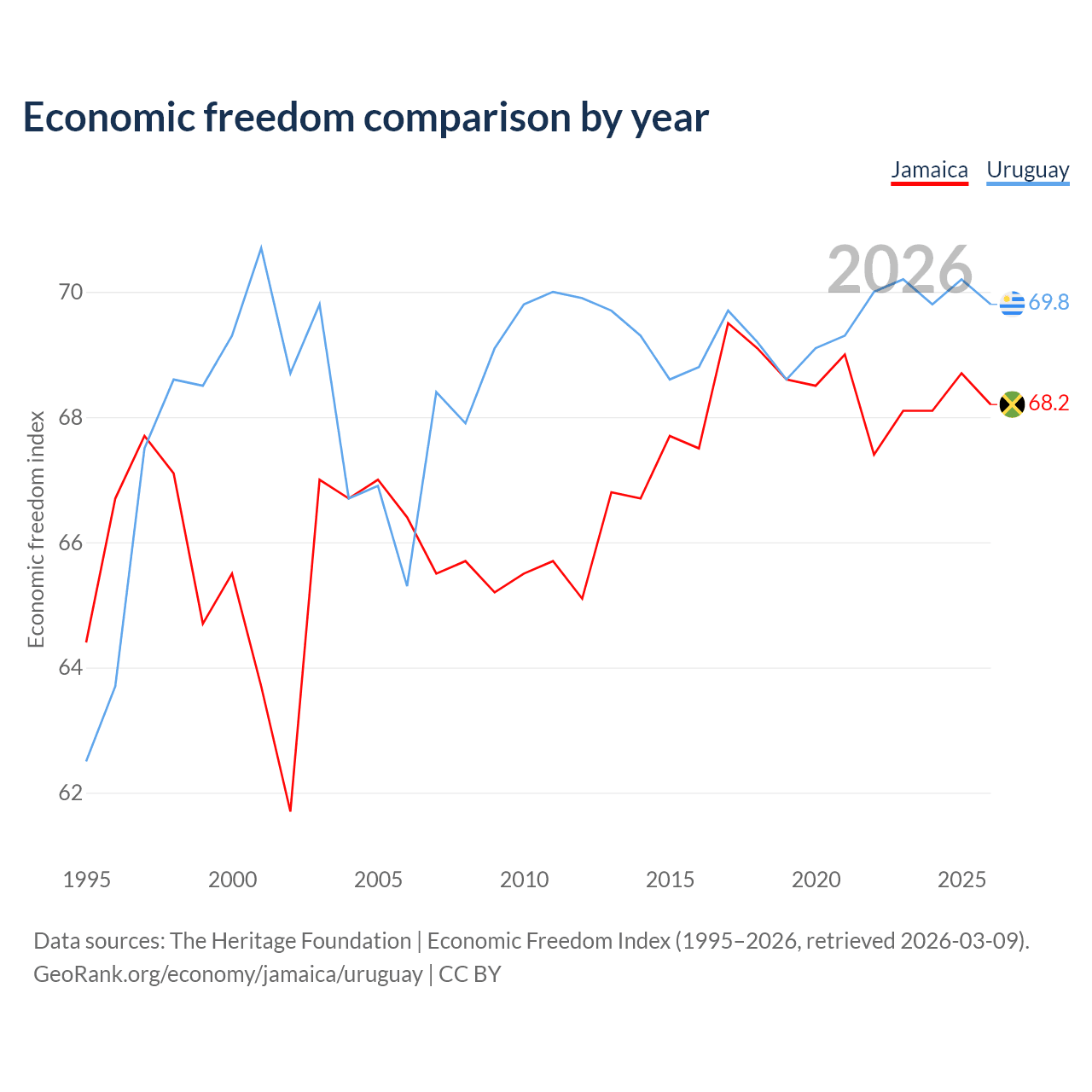 The Economic Freedom Index for Jamaica is 68.2, ranking 48/197, compared to 69.8 for Uruguay, ranking 39/197. The chart above displays a comparison of annual changes in economic freedom indexes.