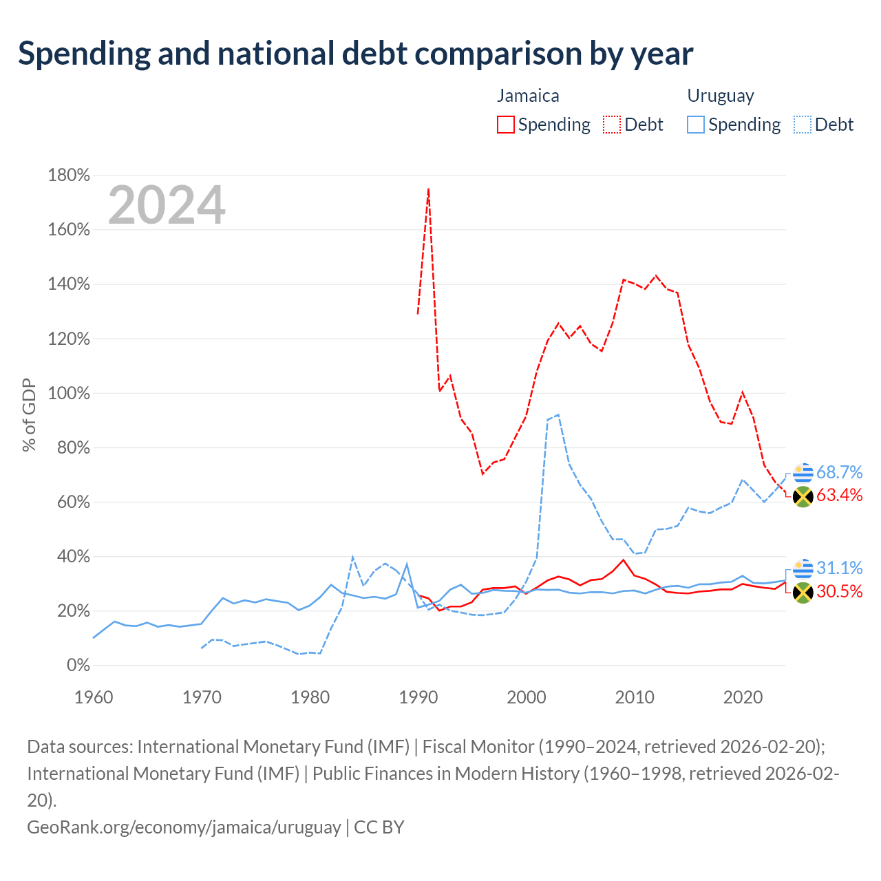 Jamaica has $14B in government debt (63.4% of GDP), compared to $55.6B (68.7% of GDP) in Uruguay.