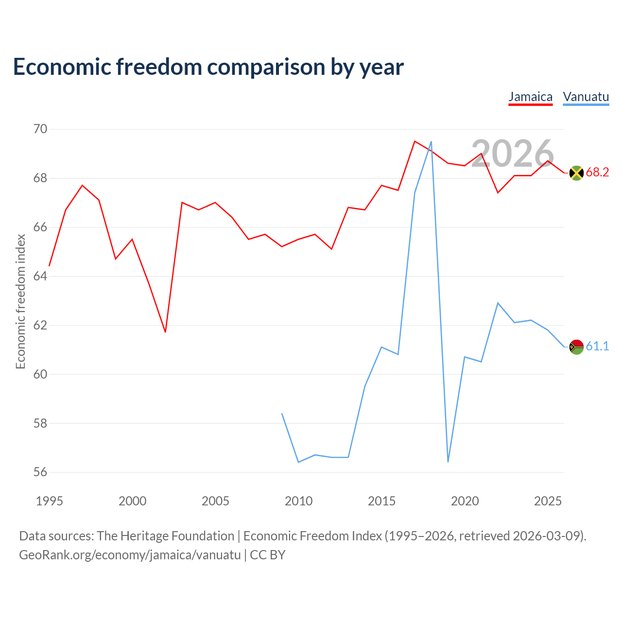 The Economic Freedom Index for Jamaica is 68.2, ranking 48/197, compared to 61.1 for Vanuatu, ranking 92/197. The chart above displays a comparison of annual changes in economic freedom indexes.