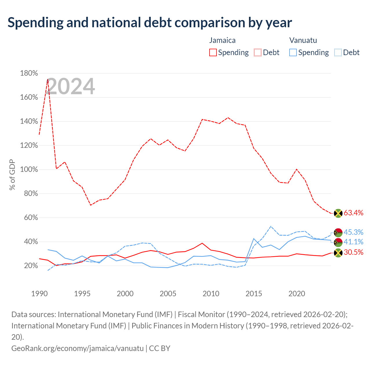 Jamaica has $14B in government debt (63.4% of GDP), compared to $507M (45.3% of GDP) in Vanuatu.