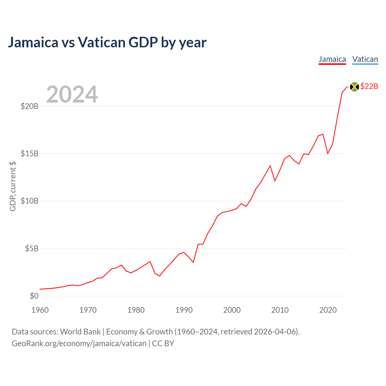 Jamaica has a GDP of $22B compared to $19.8M for the Vatican, ranking 124/197 and 197/197 by economy size, respectively.
