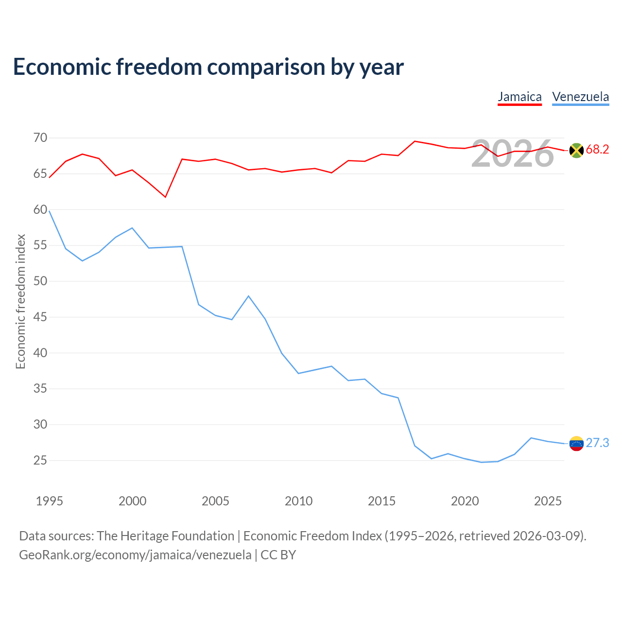 The Economic Freedom Index for Jamaica is 68.2, ranking 48/197, compared to 27.3 for Venezuela, ranking 194/197. The chart above displays a comparison of annual changes in economic freedom indexes.