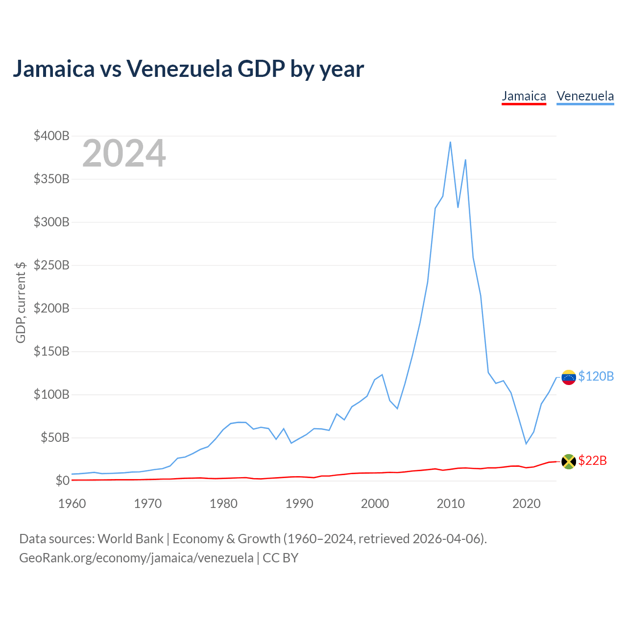 Jamaica has a GDP of $22B compared to $120B for Venezuela, ranking 124/197 and 65/197 by economy size, respectively.