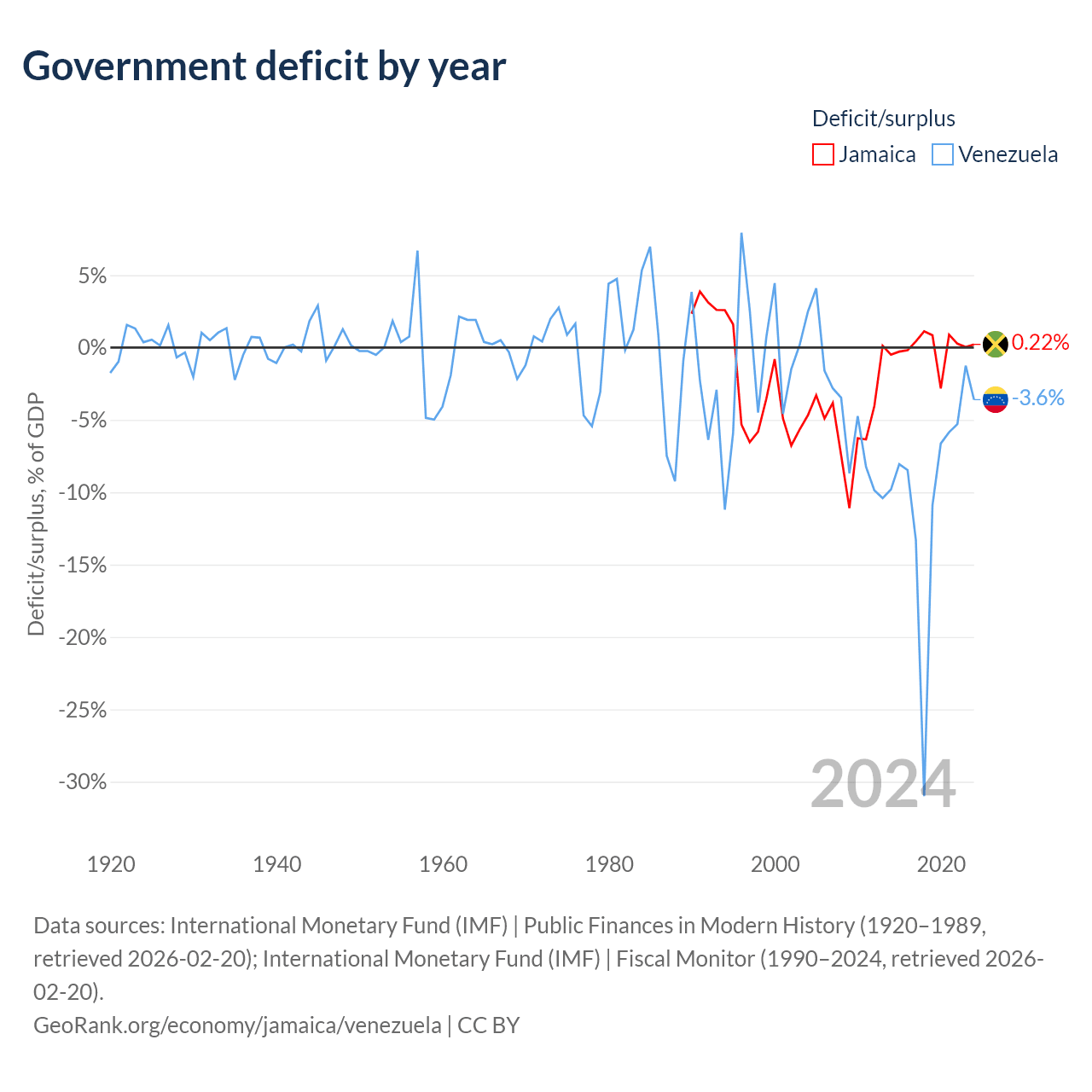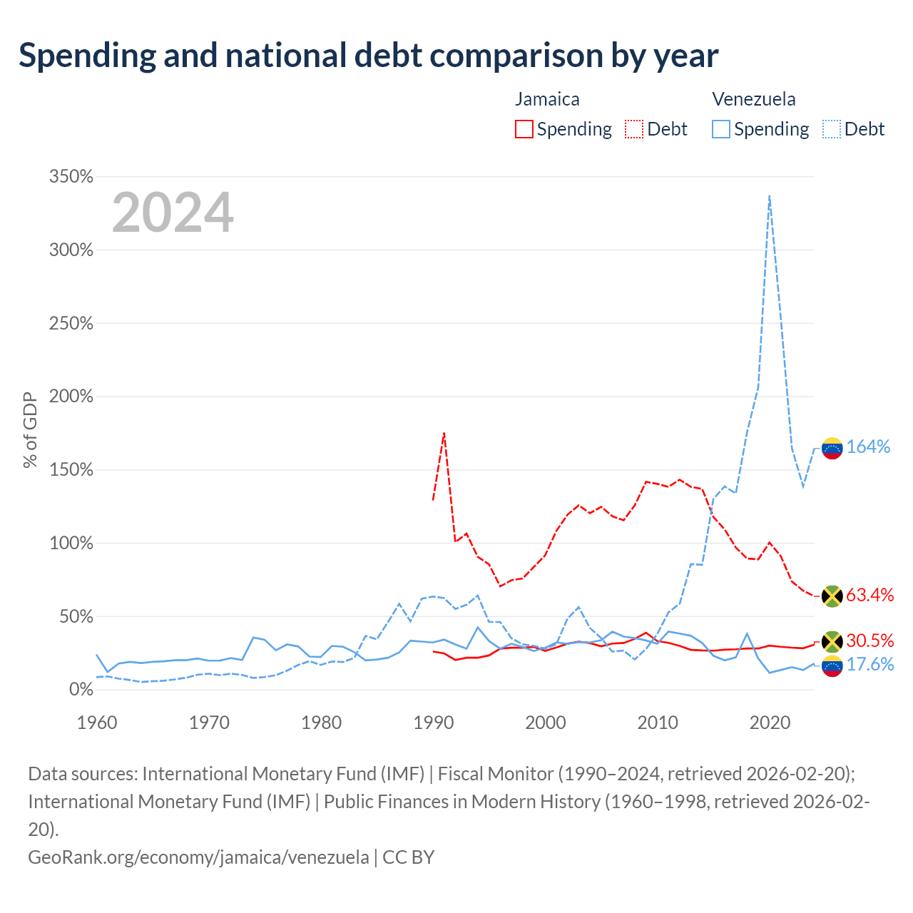 Jamaica has $14B in government debt (63.4% of GDP), compared to $197B (164.3% of GDP) in Venezuela.