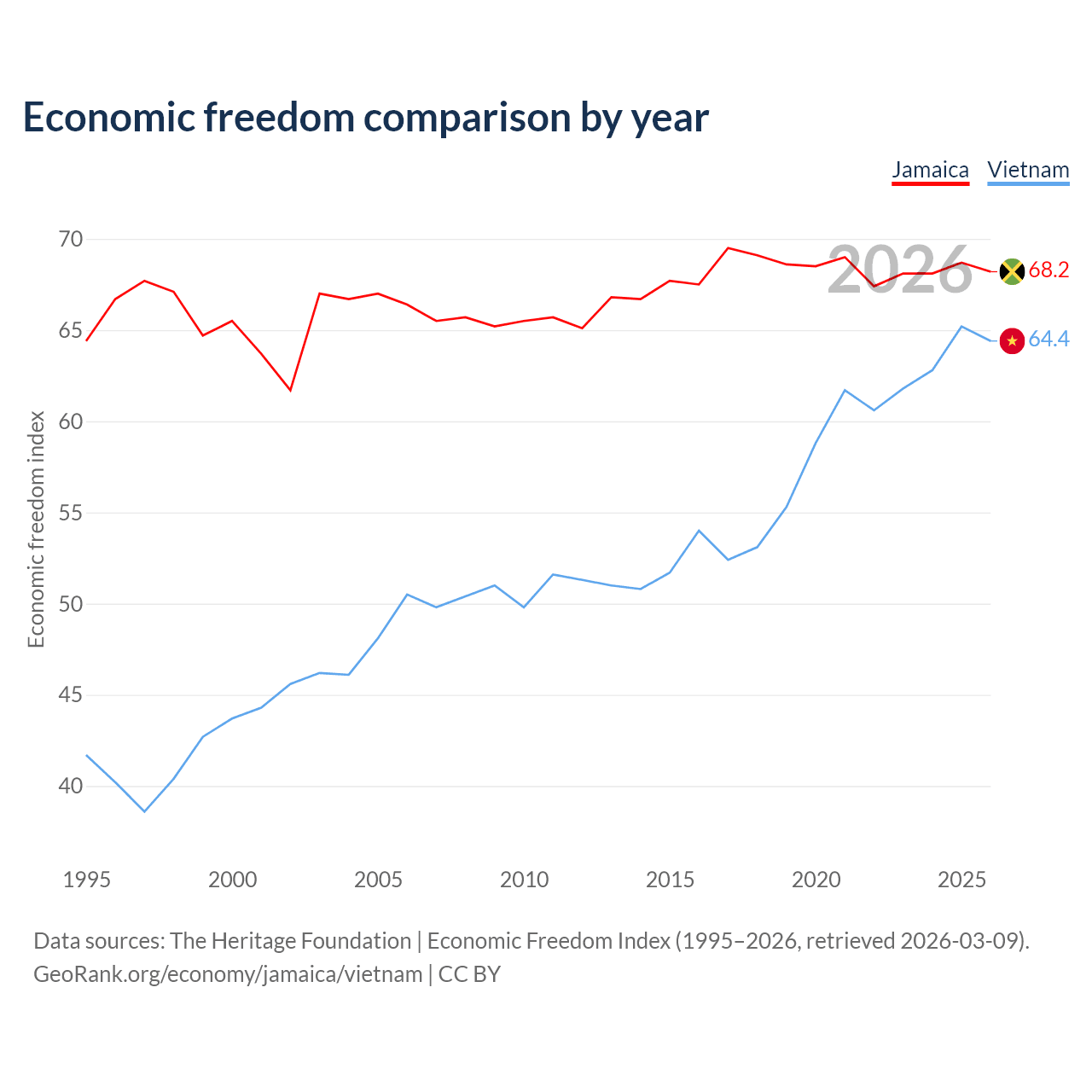 The Economic Freedom Index for Jamaica is 68.2, ranking 48/197, compared to 64.4 for Vietnam, ranking 73/197. The chart above displays a comparison of annual changes in economic freedom indexes.