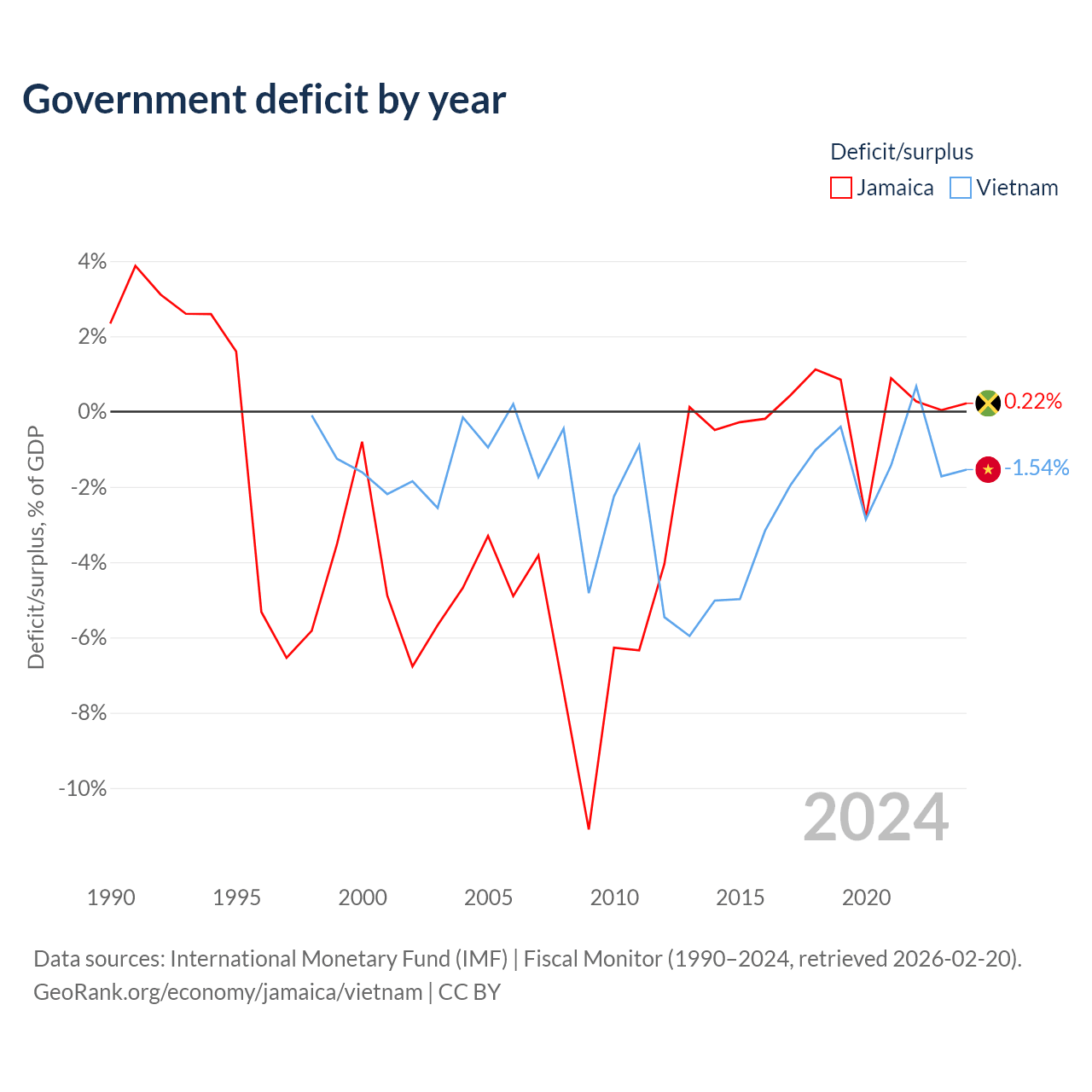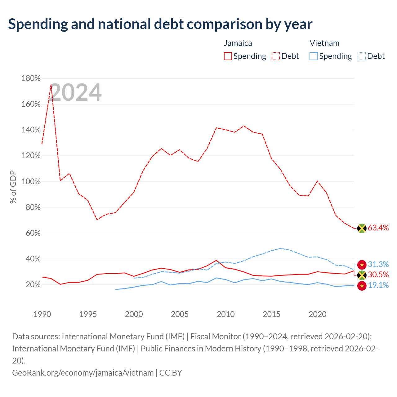 Jamaica has $14B in government debt (63.4% of GDP), compared to $149B (31.3% of GDP) in Vietnam.