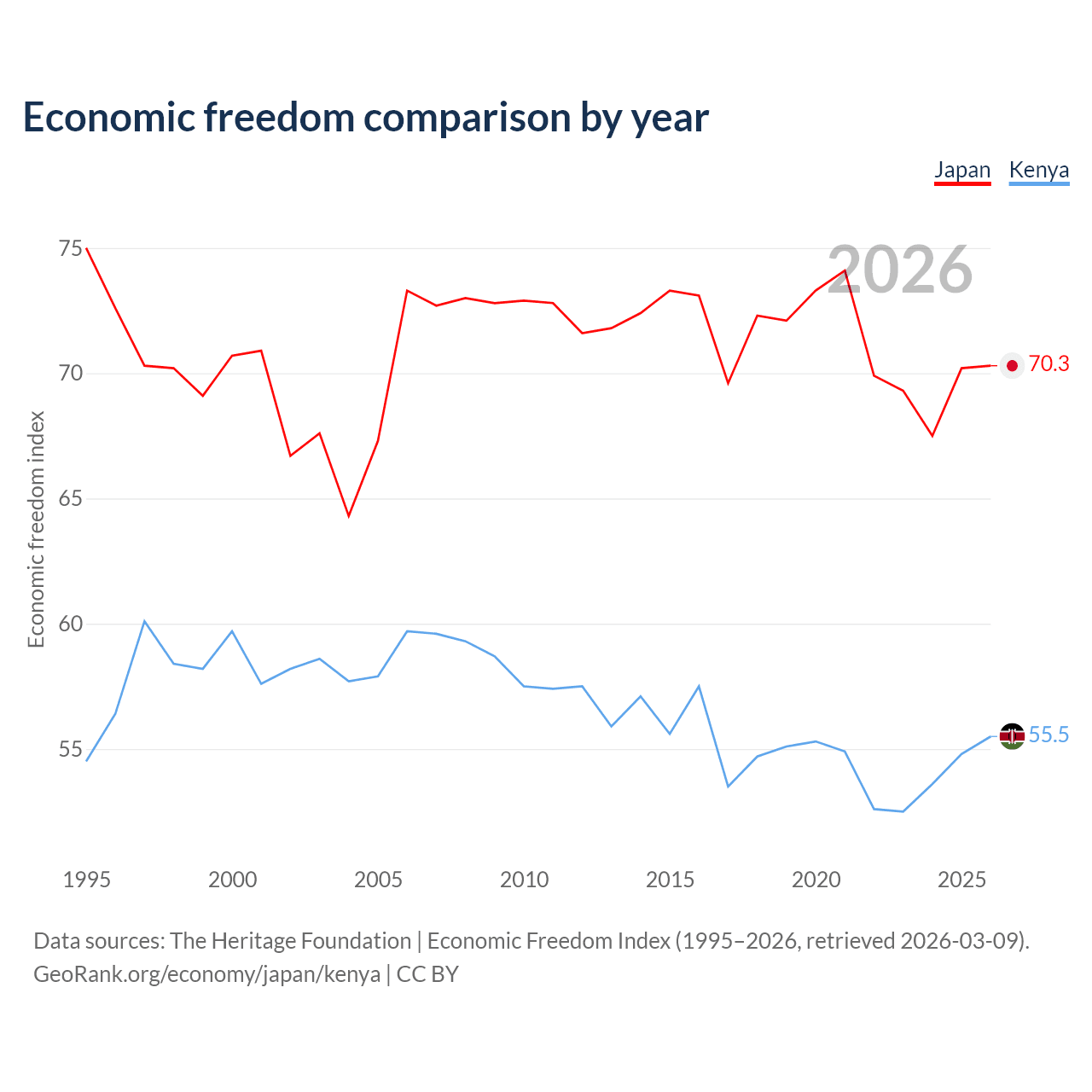 The Economic Freedom Index for Japan is 70.3, ranking 36/197, compared to 55.5 for Kenya, ranking 128/197. The chart above displays a comparison of annual changes in economic freedom indexes.