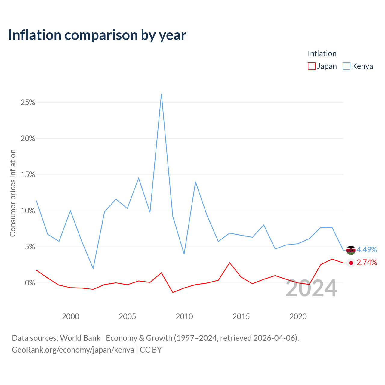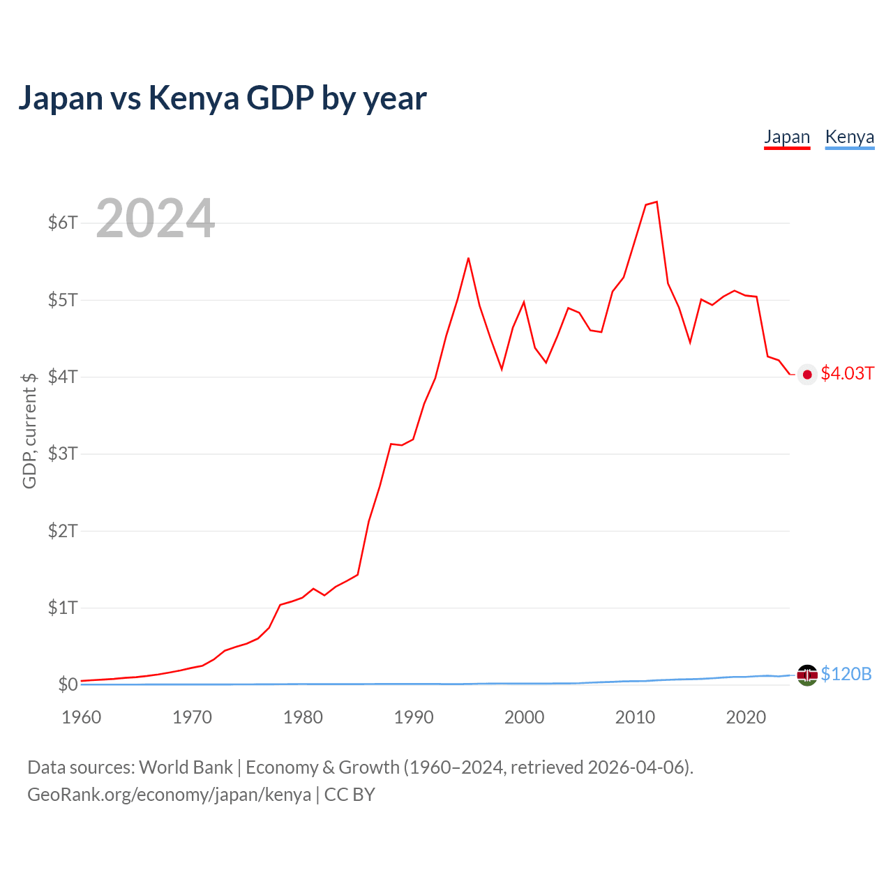 Japan has a GDP of $4.03T compared to $120B for Kenya, ranking 4/197 and 64/197 by economy size, respectively.