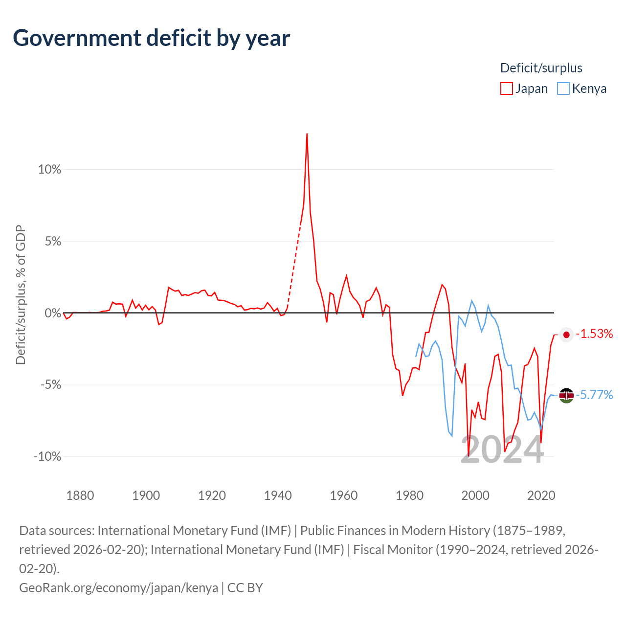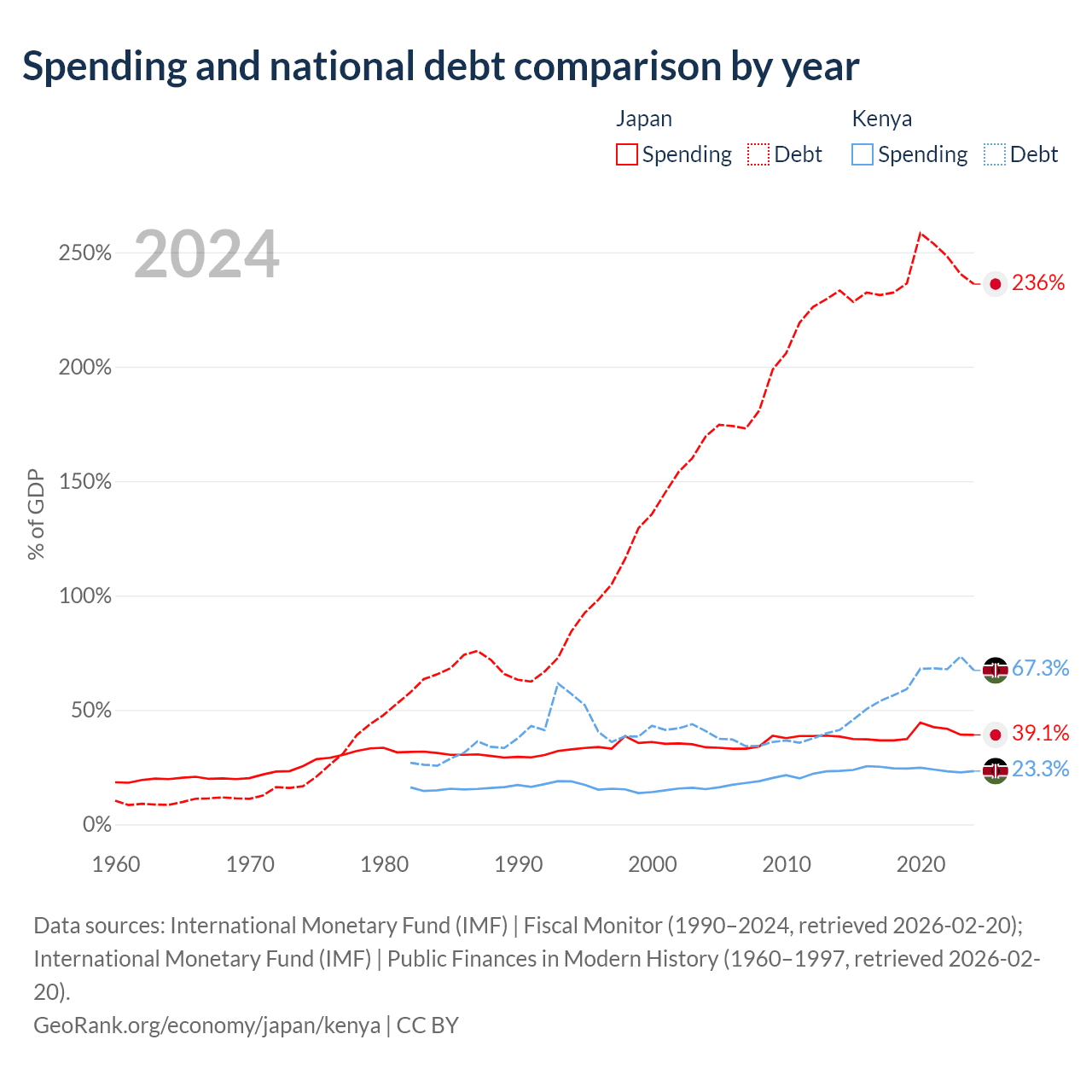 Japan has $9.51T in government debt (236.1% of GDP), compared to $81B (67.3% of GDP) in Kenya.