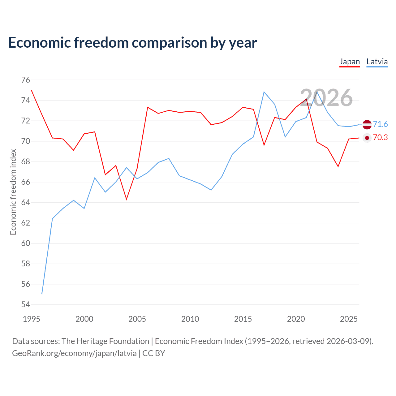 The Economic Freedom Index for Japan is 70.3, ranking 36/197, compared to 71.6 for Latvia, ranking 31/197. The chart above displays a comparison of annual changes in economic freedom indexes.
