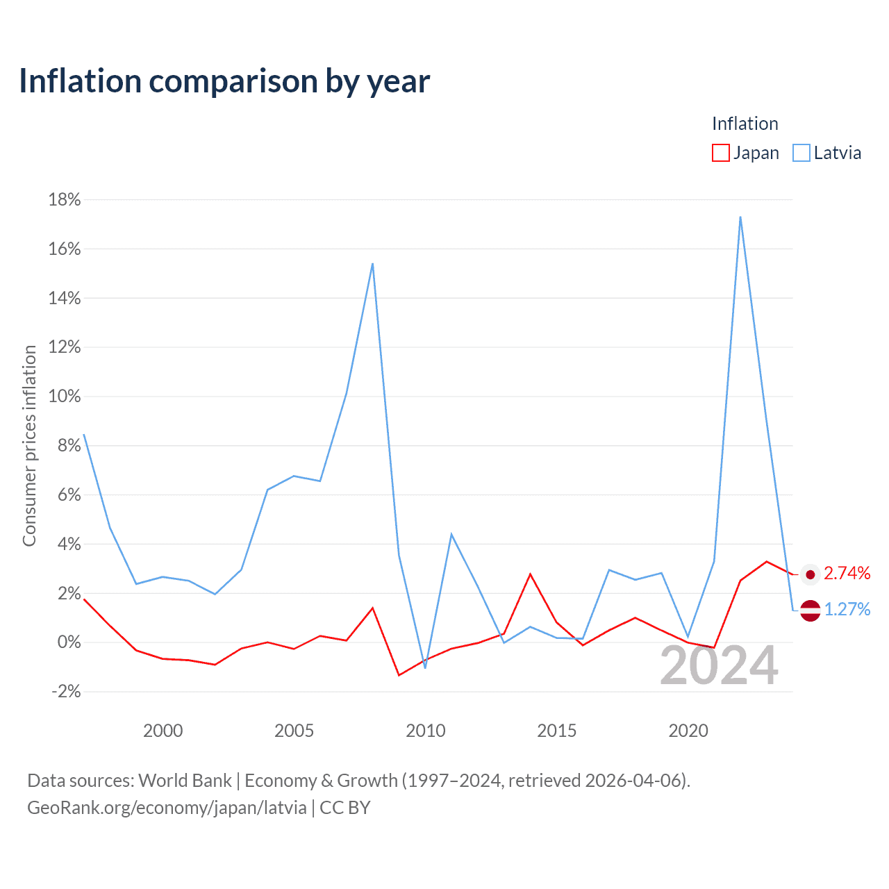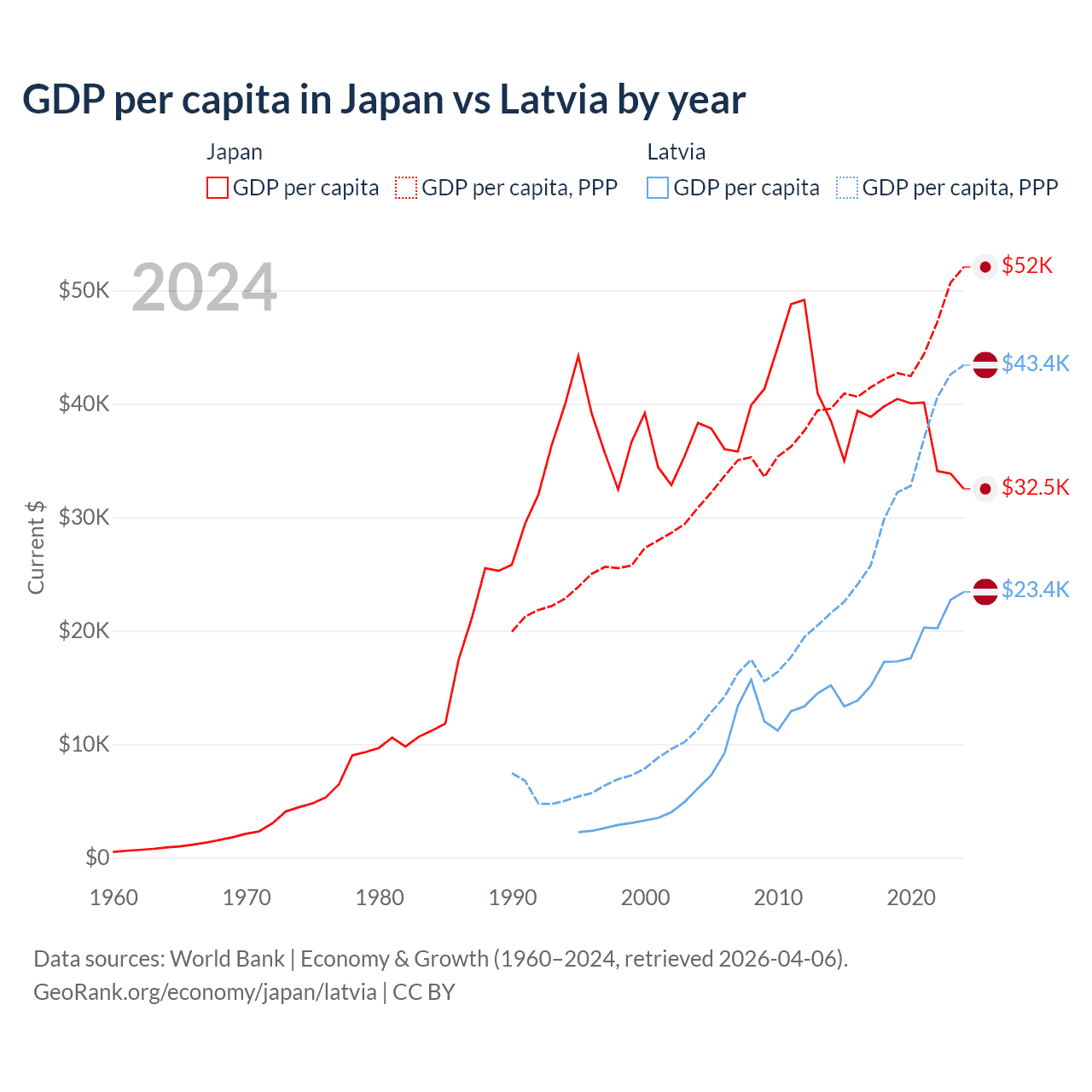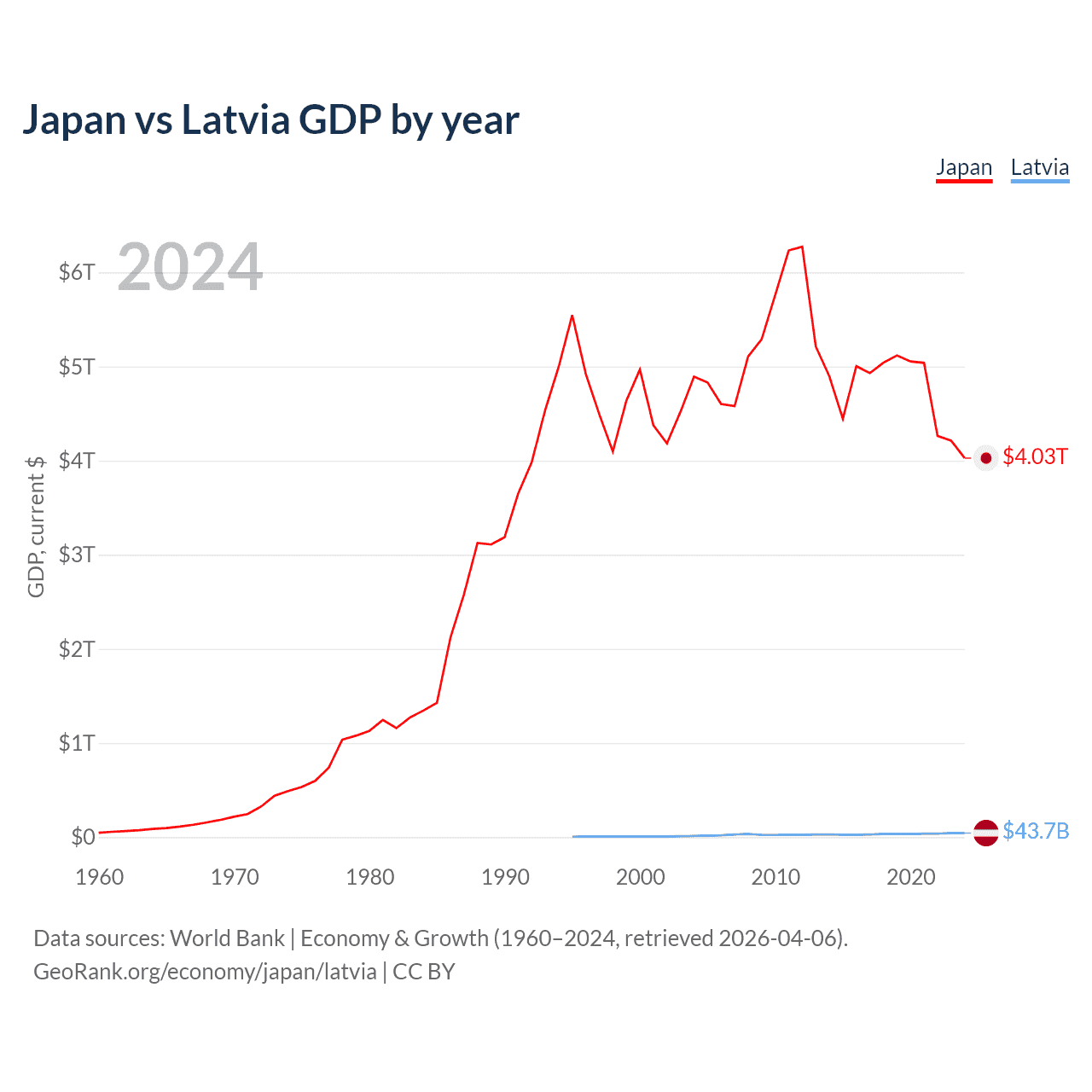 Japan has a GDP of $4.03T compared to $43.7B for Latvia, ranking 4/197 and 99/197 by economy size, respectively.
