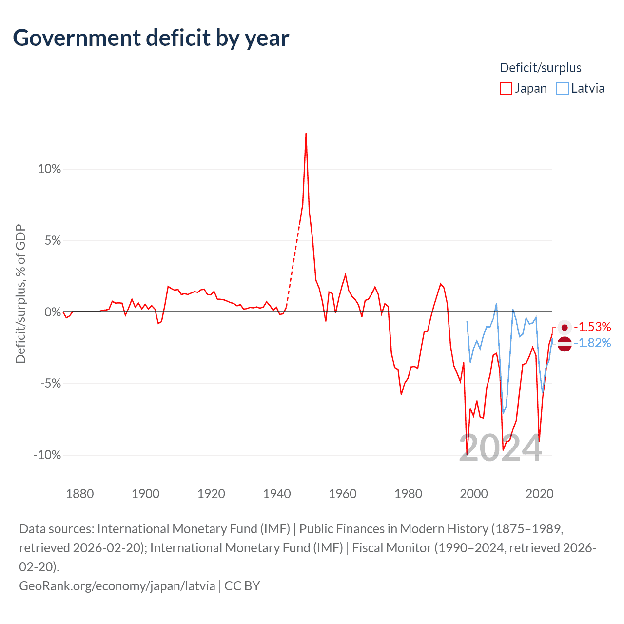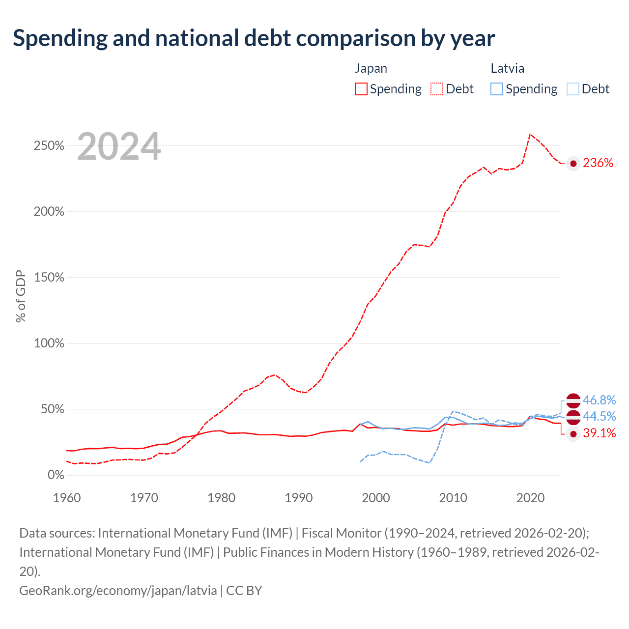 Japan has $9.51T in government debt (236.1% of GDP), compared to $20.4B (46.8% of GDP) in Latvia.