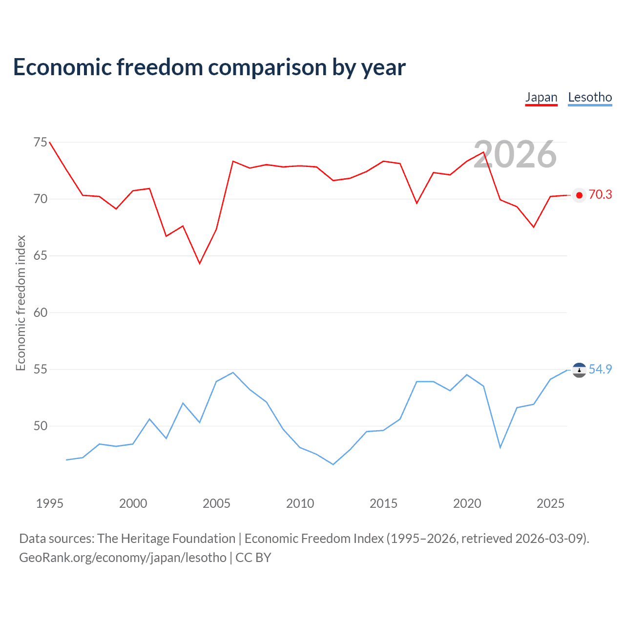 The Economic Freedom Index for Japan is 70.3, ranking 36/197, compared to 54.9 for Lesotho, ranking 130/197. The chart above displays a comparison of annual changes in economic freedom indexes.