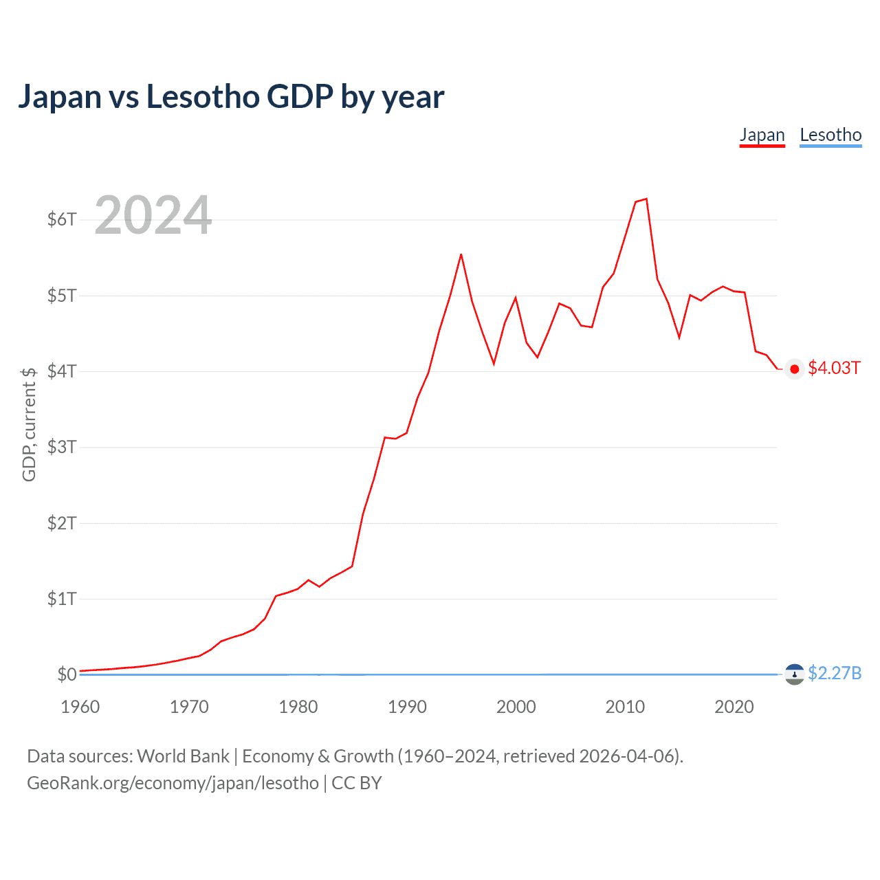 Japan has a GDP of $4.03T compared to $2.27B for Lesotho, ranking 4/197 and 175/197 by economy size, respectively.
