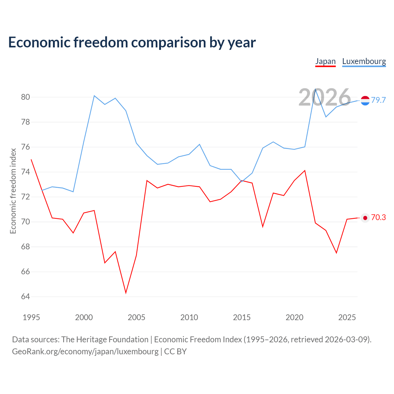 The Economic Freedom Index for Japan is 70.3, ranking 36/197, compared to 79.7 for Luxembourg, ranking 7/197. The chart above displays a comparison of annual changes in economic freedom indexes.