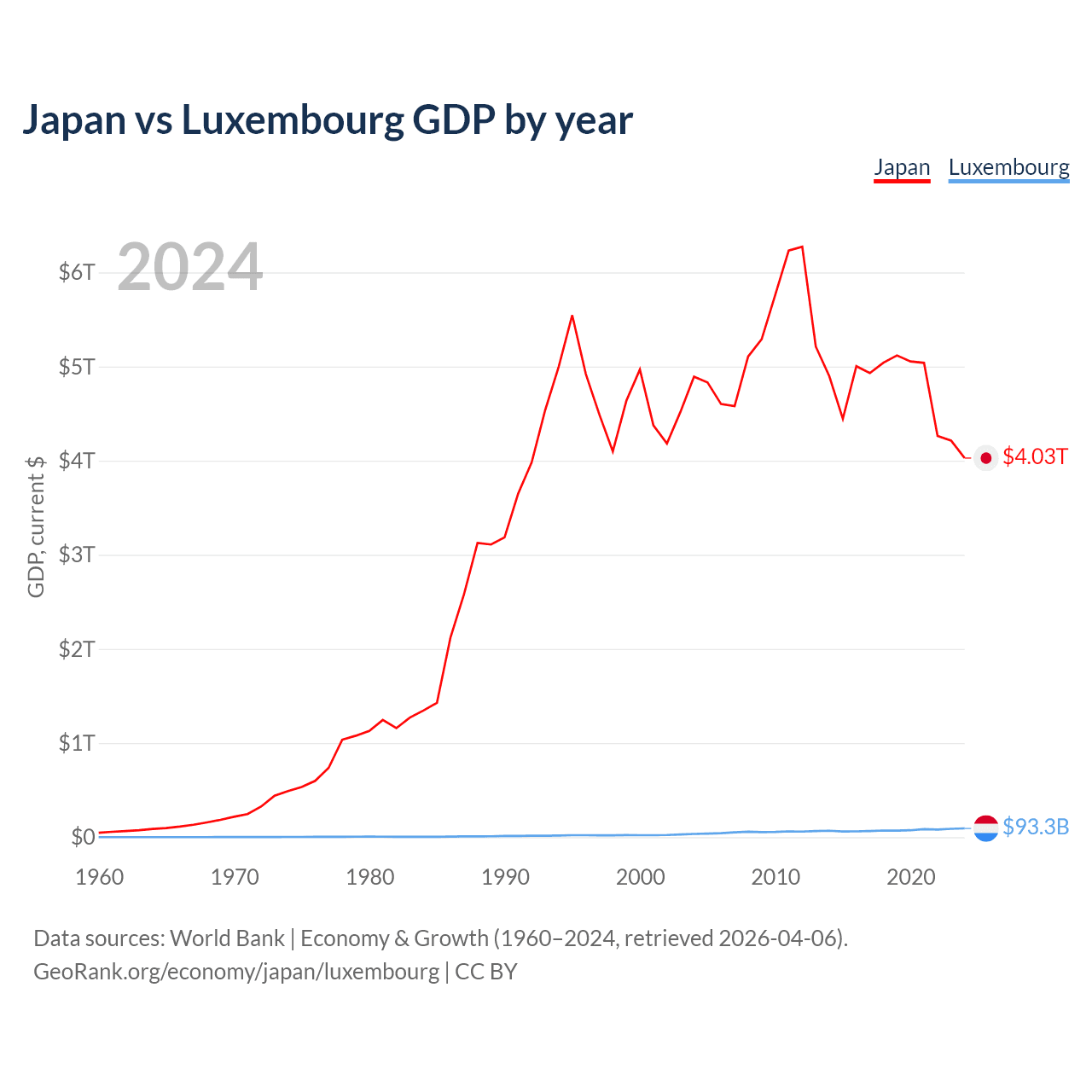 Japan has a GDP of $4.03T compared to $93.3B for Luxembourg, ranking 4/197 and 74/197 by economy size, respectively.