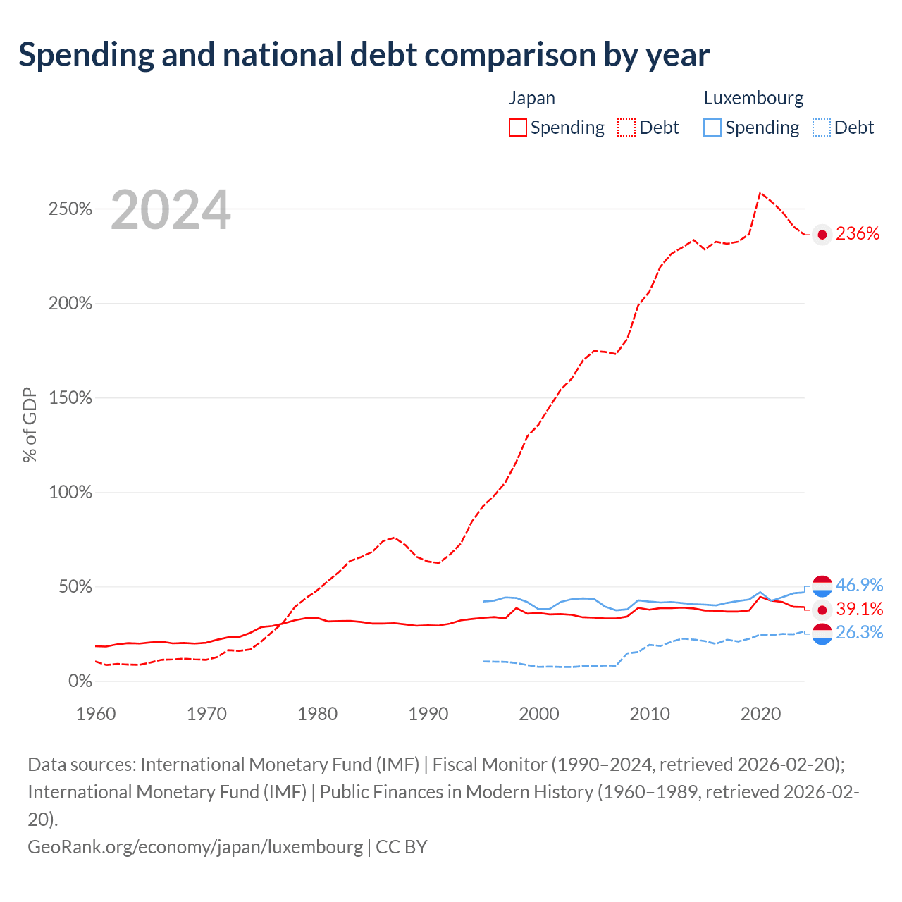 Japan has $9.51T in government debt (236.1% of GDP), compared to $24.5B (26.3% of GDP) in Luxembourg.