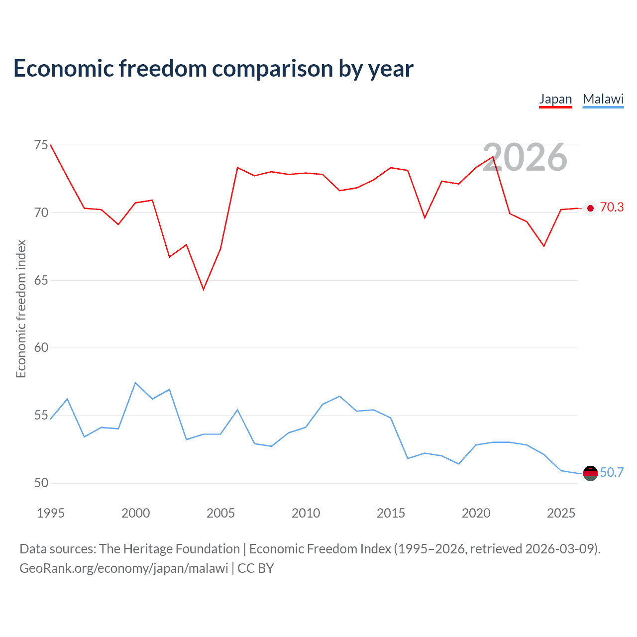 The Economic Freedom Index for Japan is 70.3, ranking 36/197, compared to 50.7 for Malawi, ranking 159/197. The chart above displays a comparison of annual changes in economic freedom indexes.