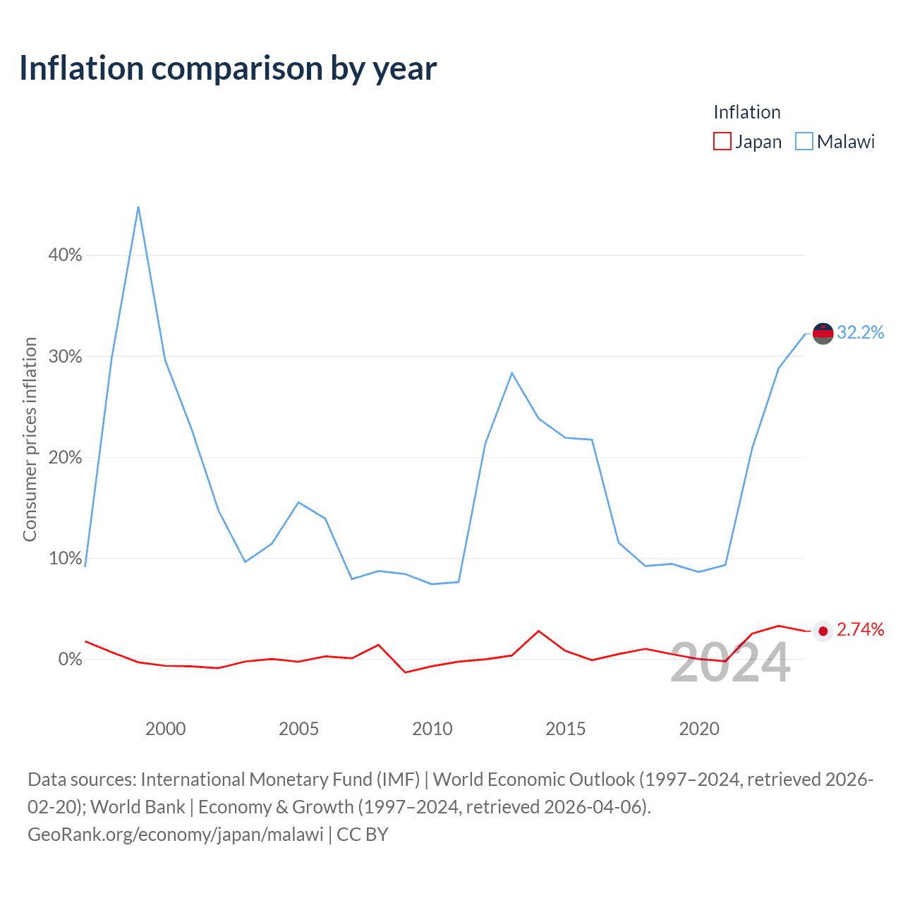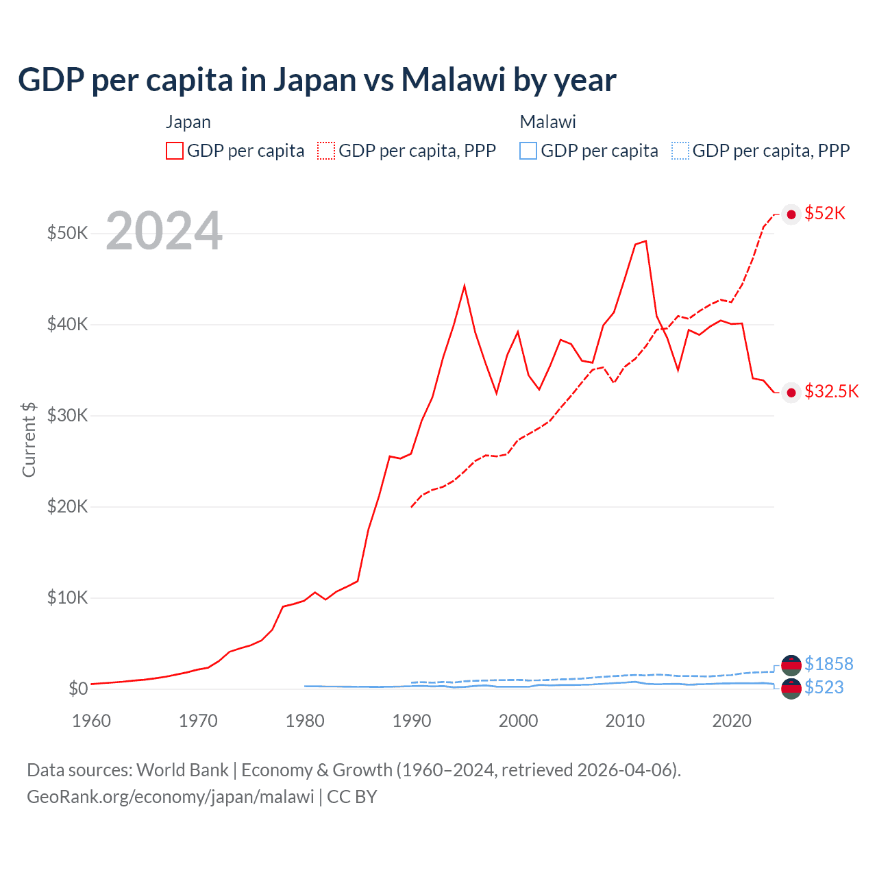 Japan has a GDP of $4.03T compared to $11.3B for Malawi, ranking 4/197 and 151/197 by economy size, respectively.