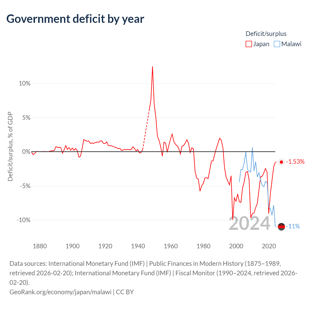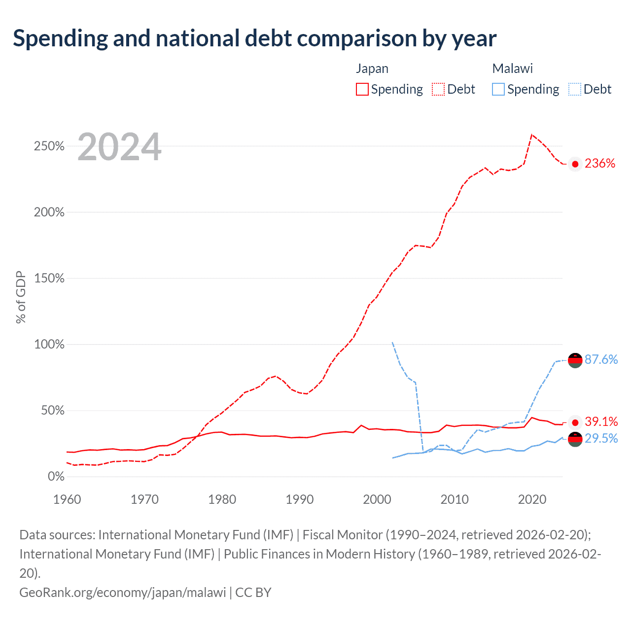 Japan has $9.51T in government debt (236.1% of GDP), compared to $9.91B (87.6% of GDP) in Malawi.