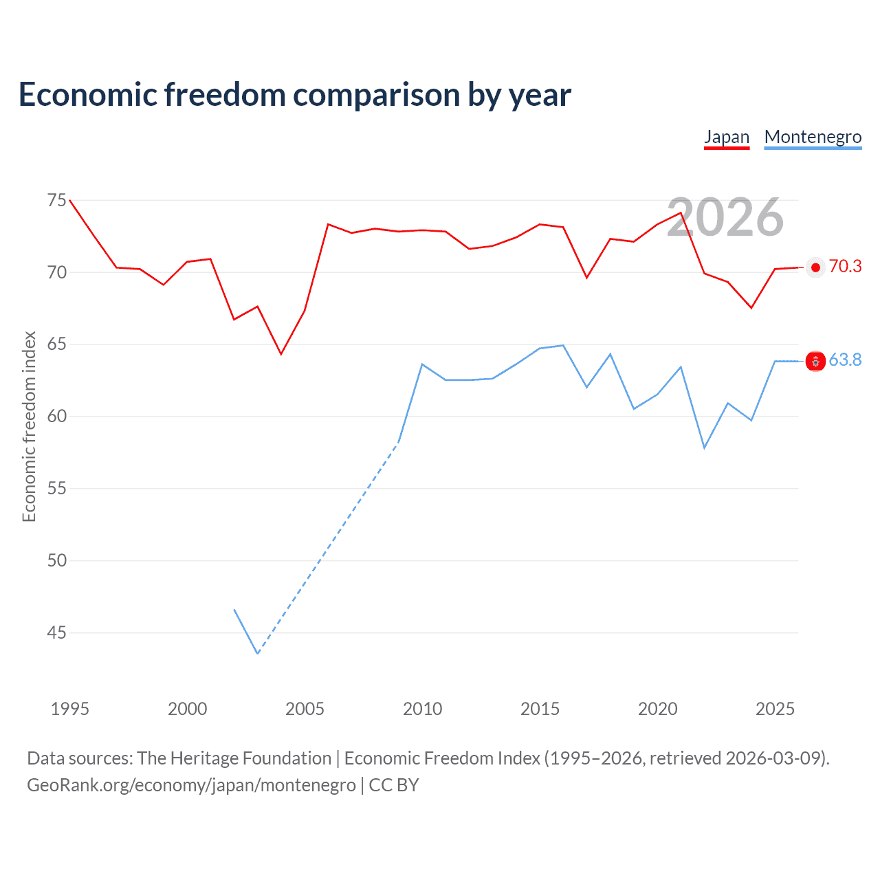 The Economic Freedom Index for Japan is 70.3, ranking 36/197, compared to 63.8 for Montenegro, ranking 78/197. The chart above displays a comparison of annual changes in economic freedom indexes.