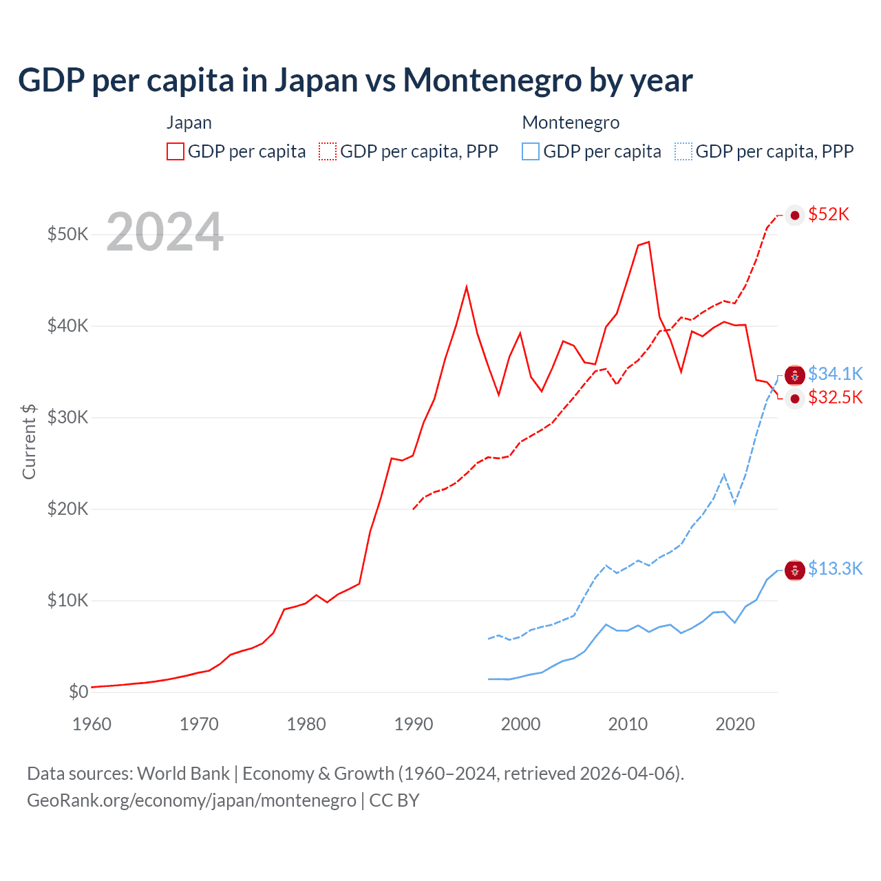 Japan has a GDP of $4.03T compared to $8.27B for Montenegro, ranking 4/197 and 155/197 by economy size, respectively.