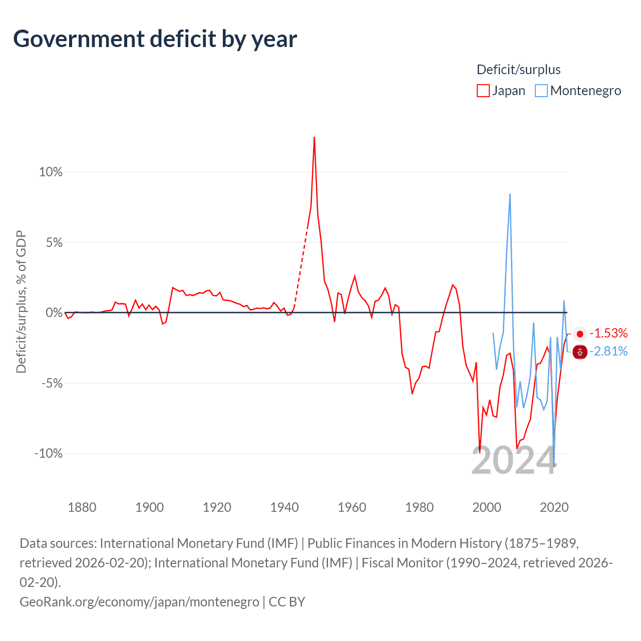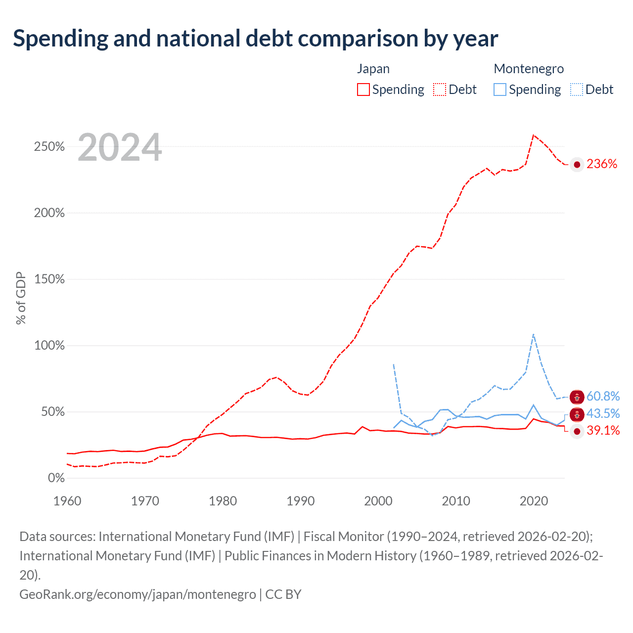 Japan has $9.51T in government debt (236.1% of GDP), compared to $5.02B (60.8% of GDP) in Montenegro.