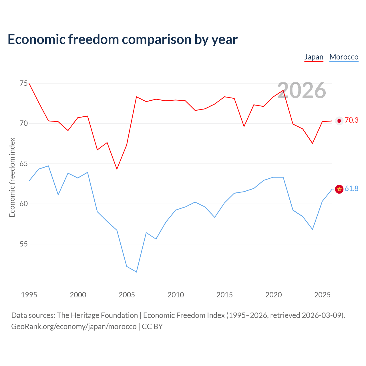The Economic Freedom Index for Japan is 70.3, ranking 36/197, compared to 61.8 for Morocco, ranking 91/197. The chart above displays a comparison of annual changes in economic freedom indexes.