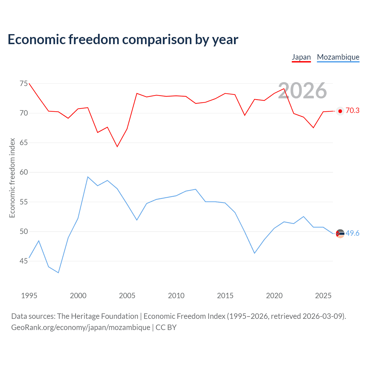 The Economic Freedom Index for Japan is 70.3, ranking 36/197, compared to 49.6 for Mozambique, ranking 164/197. The chart above displays a comparison of annual changes in economic freedom indexes.