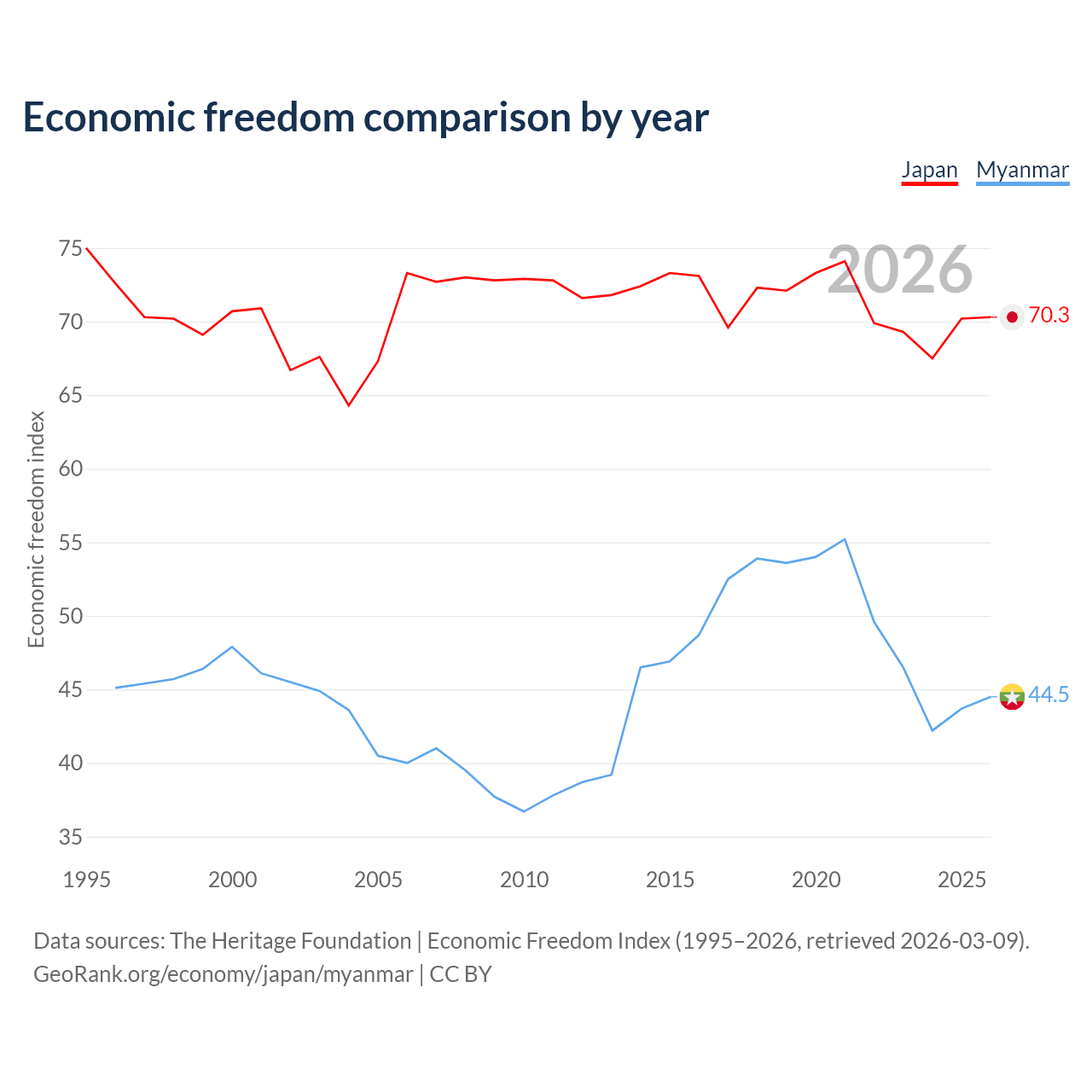 The Economic Freedom Index for Japan is 70.3, ranking 36/197, compared to 44.5 for Myanmar, ranking 180/197. The chart above displays a comparison of annual changes in economic freedom indexes.