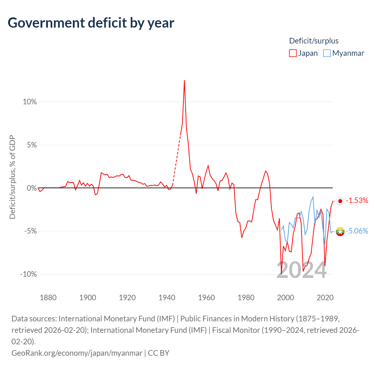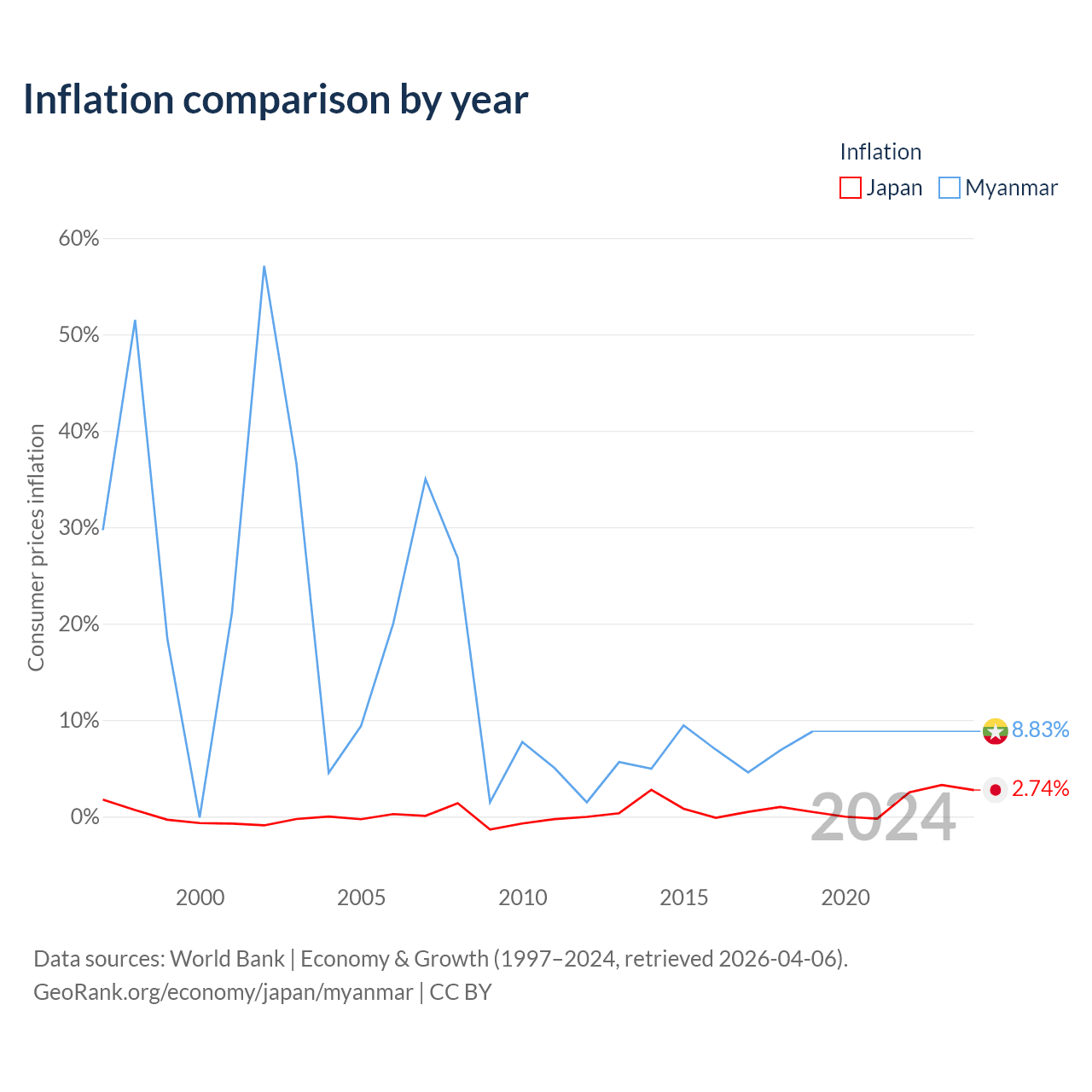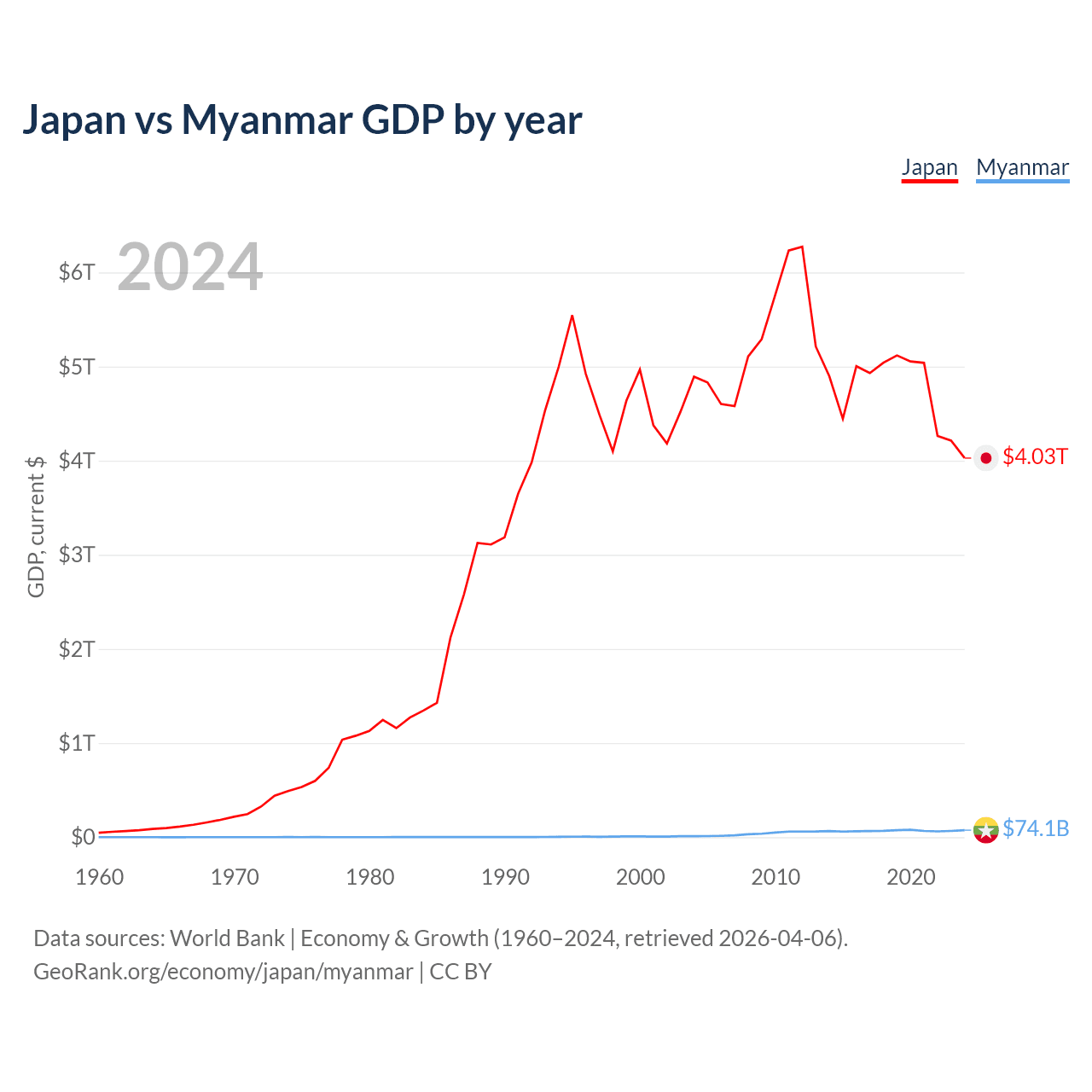 Japan has a GDP of $4.03T compared to $74.1B for Myanmar, ranking 4/197 and 85/197 by economy size, respectively.